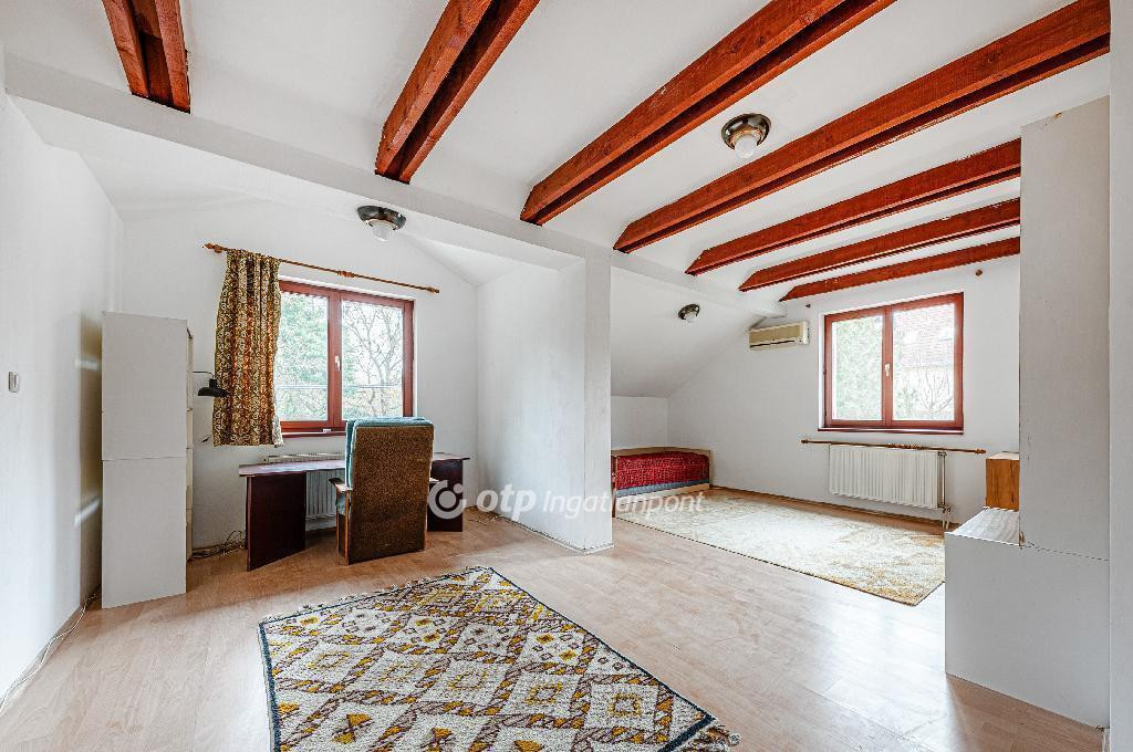 A teljes értékű tetőtérben két szoba -melyből az egyik kettéosztható-, nagy méretű fürdőszoba, külön wc és gardrób kapott helyet.
