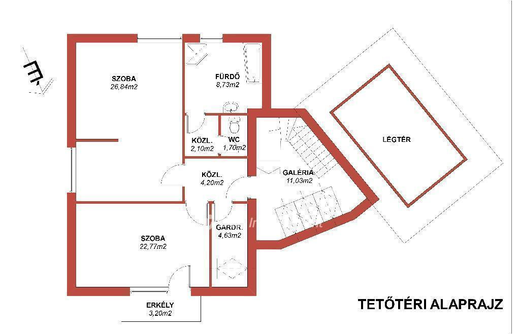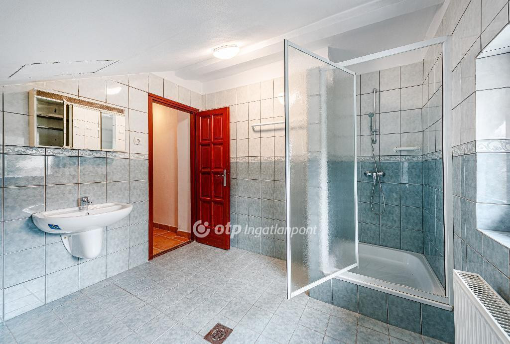 A teljes értékű tetőtérben két szoba -melyből az egyik kettéosztható-, nagy méretű fürdőszoba, külön wc és gardrób kapott helyet.