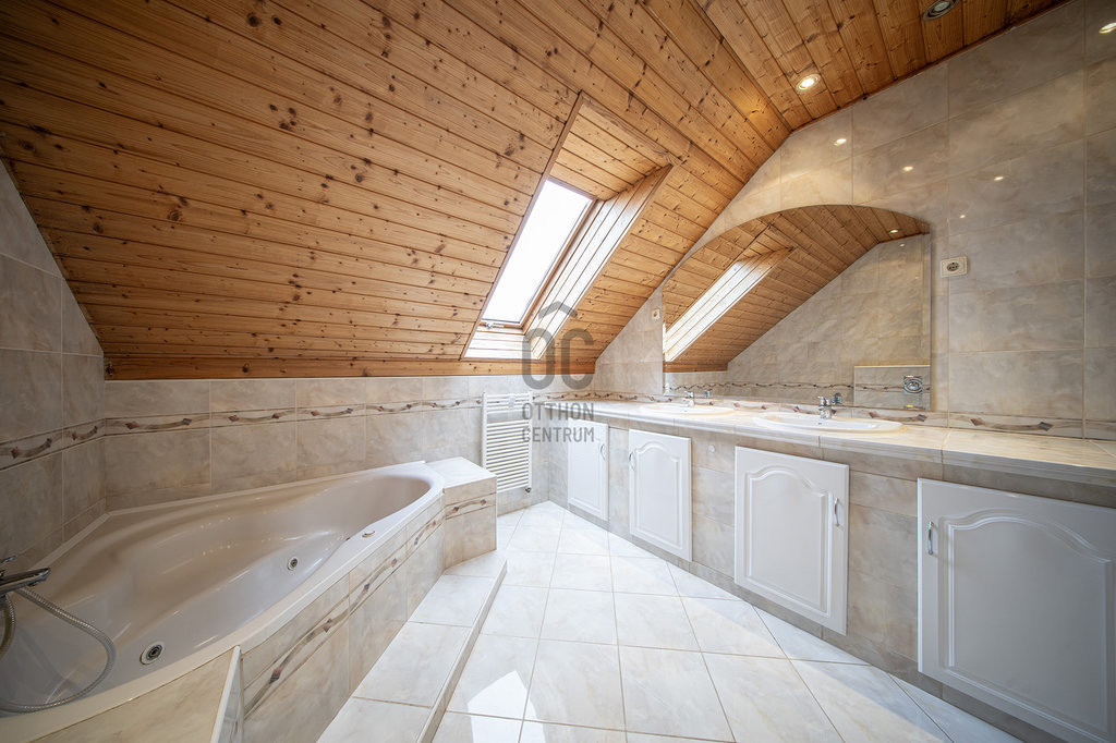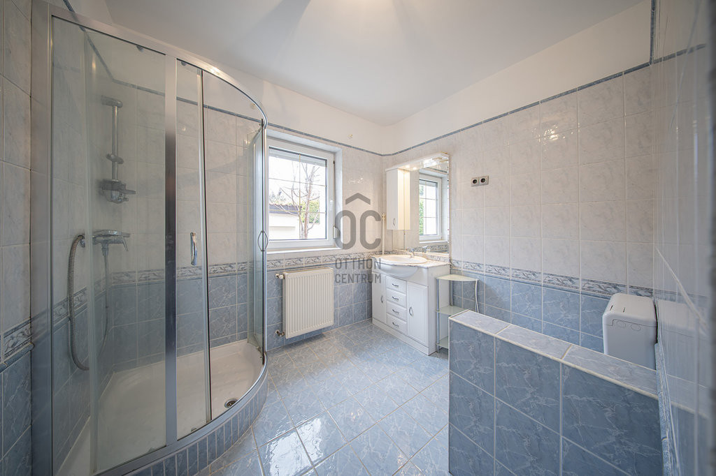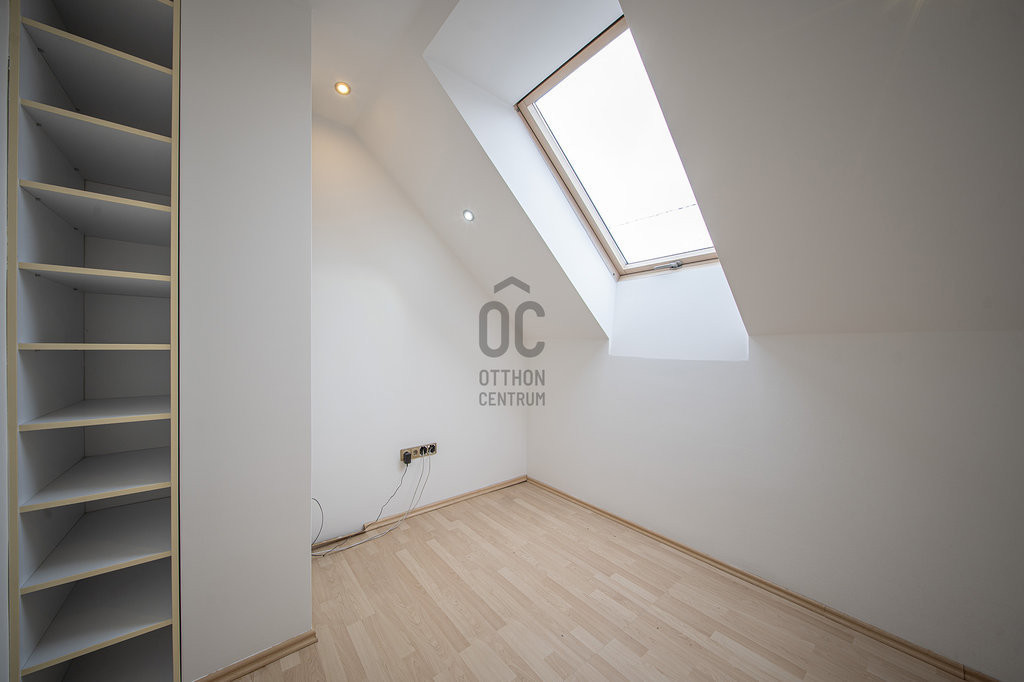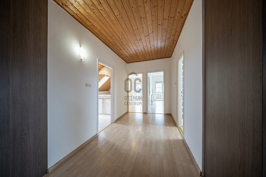 A masszív, tömörfából felépített, kellemesen széles lépcső vezet az emeletre, ahol tágas galéria/közlekedő, óriási (22,45 m2-es) szülői háló saját fürdőszoba/WC-vel, gardróbbal, szauna (nem megépített), kis dolgozószoba (4,82 m2), nagy fürdőszoba sarokkáddal, és két nagy gyerekszoba található. A két gyerekszobából közös erkély nyílik, ahonnan a kertre van kilátás.