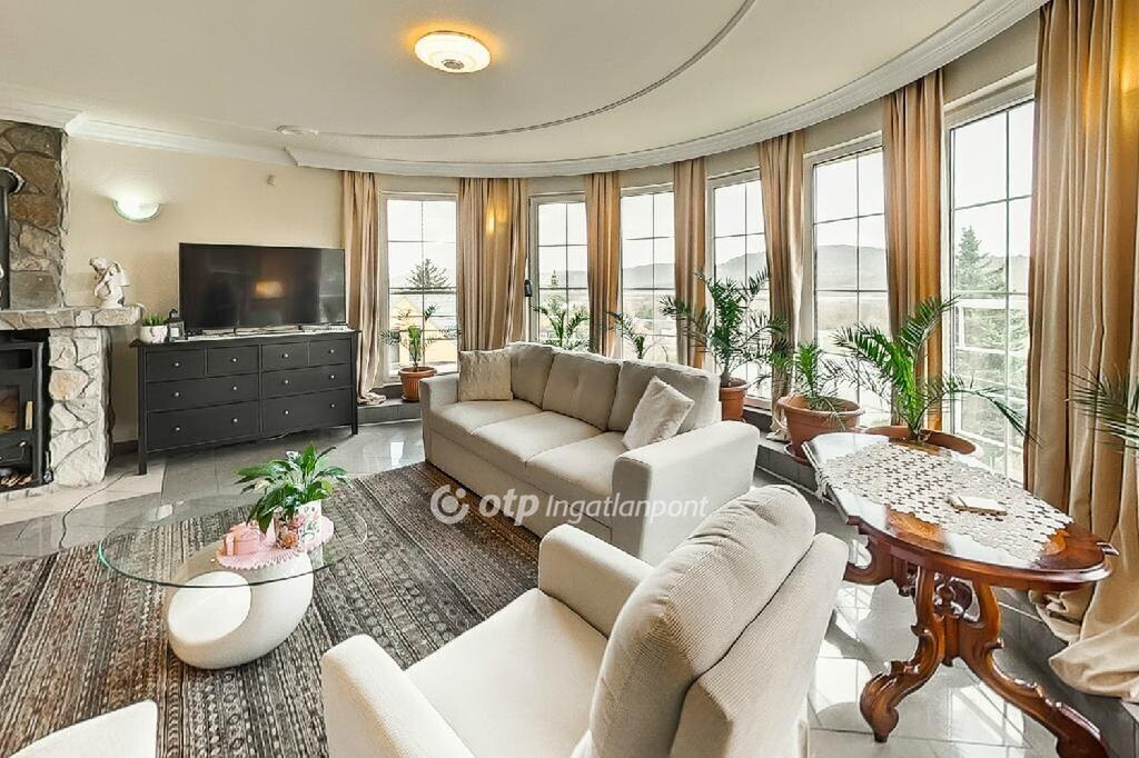 A villa egyedi karakterét és különleges atmoszféráját az első emeleti nappali adja, amely egyben van a modern fekete konyhával és étkezővel. Félköríves kialakítása és az egyedi nyílászárók teszik igazán különlegessé - a ház igazi ékköve (10 ablak és 4 teraszajtó biztosítja a természetes fényt). Innen is élvezhető a 180 fokos panoráma, miközben a márványgránit burkolat és a nappaliban található kandalló harmonikusan idézi meg a toszkán villák elegáns, időtlen stílusát.