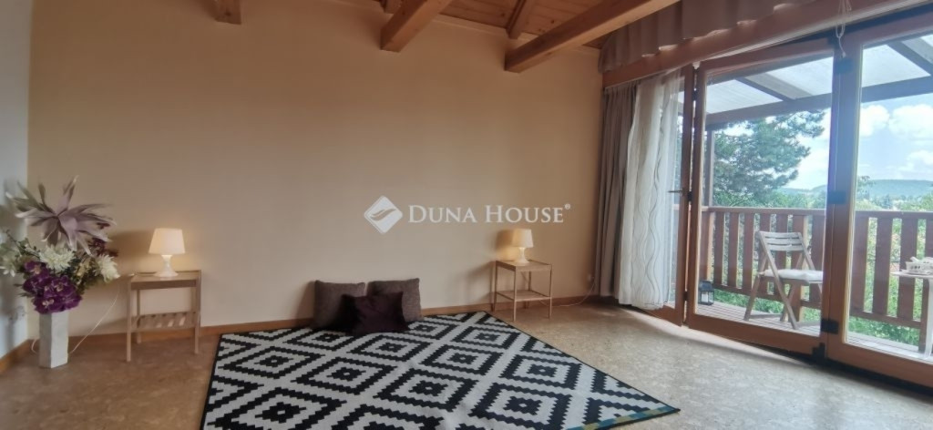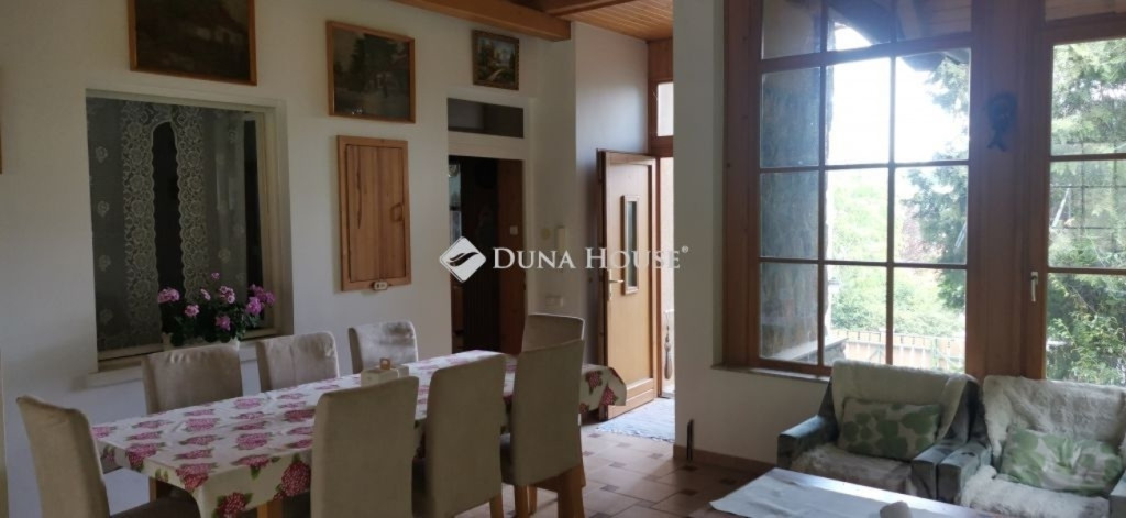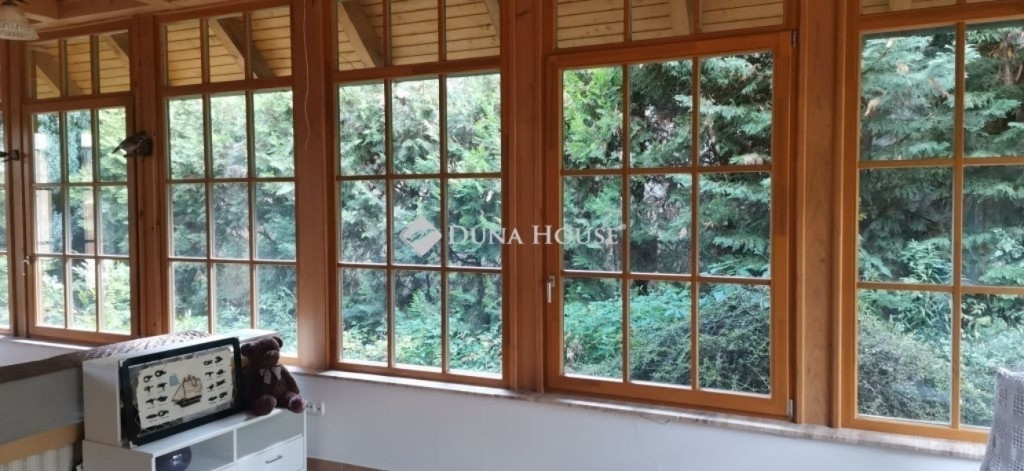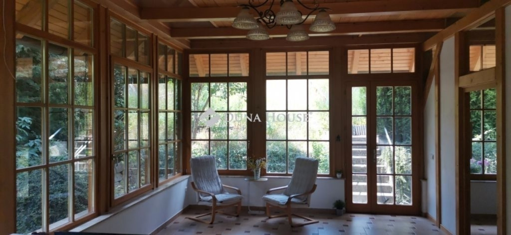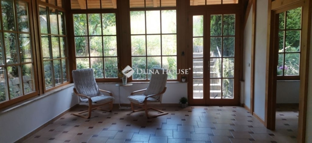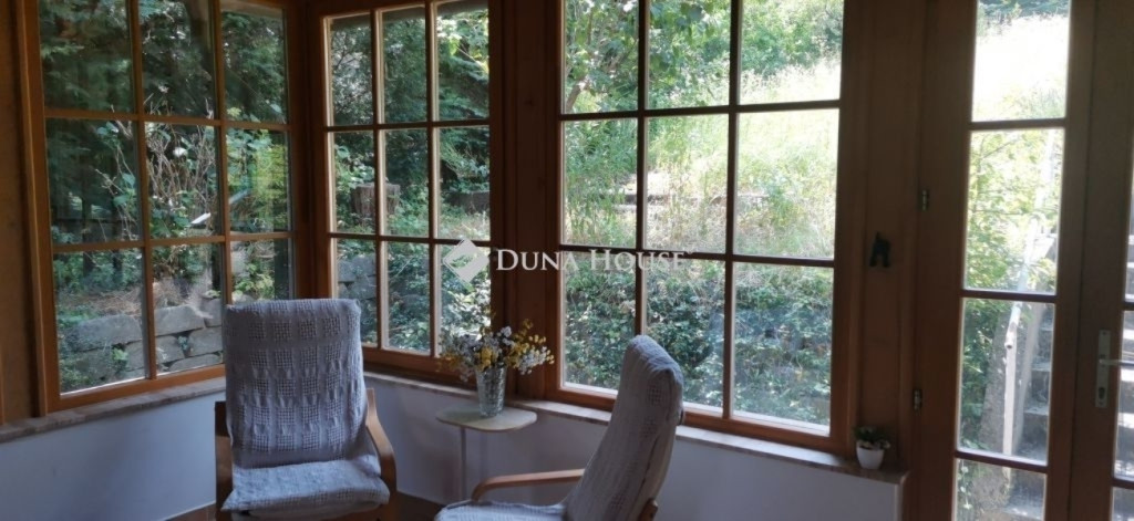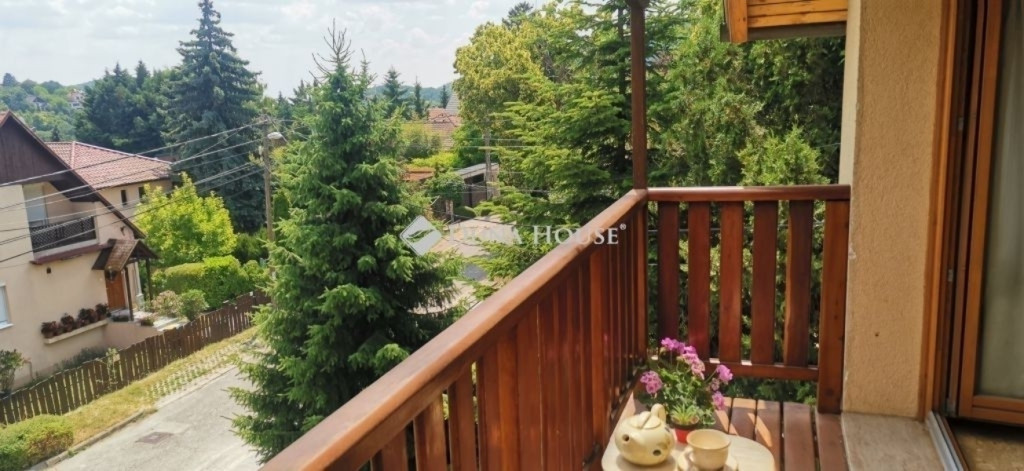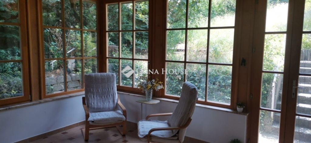 A ház 2005-ben épült, egyedi kialakítású, tetőtér beépítéses, kétszintes tégla családi ház. Az ingatlan egyik nagy előnye, hogy akár két generáció együttélésére is alkalmas. Együtt de mégis külön! A házat egy hatalmas kert, borospince, nagyméretű garázs, valamint további autóbeállási lehetőség teszi még kényelmesebbé a nagycsaládosok számára.Fűtése, meleg víz ellátása gáz cirkóval megoldott, a földszinten padlófűtéssel kiegészítve.A két generációs házban az egyik lakrész 35 m2 nagyságú, a földszinten a bejárattól jobbra található, amely áll egy előtérből nyiló szobából, konyhából és fürdőszobából, wc-vel. A konyhából egy átadó ablak nyílik a nappaliban lévő étkezőasztal felé, amely a családi összejöveteken praktikus megoldás a vendégek kiszolgálására. A nappali különös hangulatát a három oldalán elhelyezkedő kazettás fa ablakok adják, melyek révén mintha közvetlenül a fák tövében ülnénk, miközben szemlélhetjük a természet zöldjét az énekesmadarak, a mókusok játékát. Igazán különleges érzés, bent vagyunk, de mégis kint érezzük magunkat!A másik lakrészhez tartozó konyha a tágas nappali túloldaláról nyílik, amely a hátsó kertre nyílik és az oldalkertre néz, modern és kényelmes U-alakú elrendezésével. Itt található még egy háztartási helység és egy wc mosdóval. Innen jutunk fel a kétkarú lépcsőn az emeletre, amely egy egy légterű, fenyőfával burkolt tetőtéri nappali dolgozósarokkal. Ez egy légkondcionálóval ellátott, napfényes, hatalmas belső tér, amely sok lehetőséget rejt magában, plusz érdekes megoldás, hogy körben üvegpadló van, amely a fölszinti nappalit is plusz természetes fénnyel látja el. Nagyon hangulatos, a fényképek nem adják vissza, hogy mennyivel növeli a térérzetet ez a különleges padló kialakítás.A felső szinten ezen kívül egy kisebb szoba, gyerekszoba található, melllette zuhanyzós fürdőszoba wc-vel és a hálószoba a teljes faltól-falig tartó diófa terasszal! Erről a fedett teraszról is lenyűgöző, örökpanorámás kilátás nyílik a budai hegyekre, amelyet a teljes szélességében eltolható nyílászárókkal élvezhetünk maximálisan. A kert hatalmas, kissé emelkedik felfelé a kert vége felé, felúton a domboldali borospince, amely egy földdel borított boltíves hobbit pince.A ház szigetelt, szépen bevakolt, nagyon jó állapotban van, a tulajdonosok építették a család részére, kezdetnek nyaralóként, aztán állandó lakhelyként szolgált. Jelenleg nem lakják az ingatlant, gyorsan birtokba vehető. A környék csendes, pár utcával odébb található buszjárat 10 perc alatt Hűvösvölgyben van, onnan a város fél óra alatt elérhető. A közelben óvoda, iskolák, kisebb boltok, éttermek, szolgáltatók megtalálhatóak és persze rengeteg kirándulási lehetőség.Nézzük meg együtt, ne maradjon le erről a hangulatos, egyedülálló ingatlanról! Töltse már itt a nyarat!