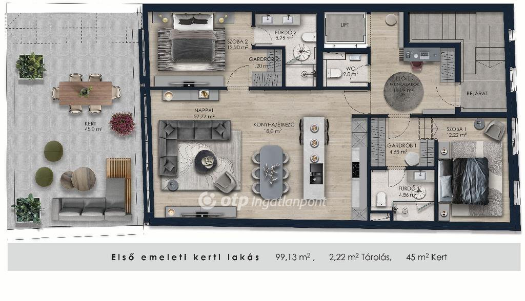 - Földszinti lakás (99,44 nm + 45 nm kert + tároló):