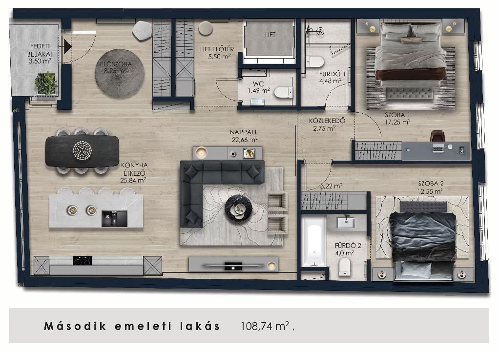 - 2. emeleti kétszintes lakás (132,58 nm + 25 nm terasz):