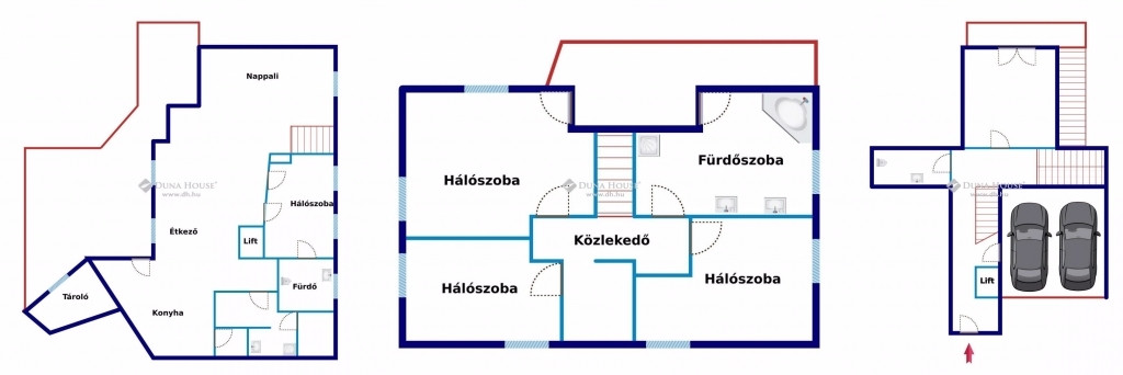 A lakás földszintjének előtér lifttel, nappali, konyha, étkező, hálószoba, fürdő, wc, tároló, terasz, emeletén 3 hálószoba, fürdő -wc, közlekedő, erkély található.