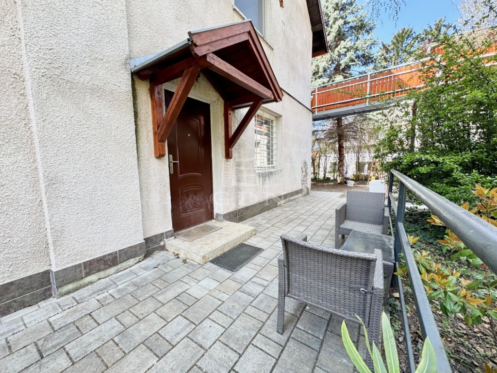 II. kerületben, Pesthidegkúton, kertvárosi környezetében, csendes utcában, 1989-ben épült, 3 lakásos társasházban, önálló helyrajzi számú, saját tulajdonú 389 nm-es ősfás kerttel rendelkező, földszinti elhelyezkedésű 150 nm-es lakóterületű, kiváló elosztású, nappali +3 hálószobás, napos-világos D-NY-i és É-K-i fekvésű, alacsony fenntartású, közösköltség: 15.000 Ft, egyedi mérésű, kombinált gázcirkó fűtésű, jó állapotú, közvetlen kertkapcsolatos lakás, beépített, gépesített konyhával, telken belüli felszíni gépkocsi beállóval, rendezett kerttel eladó!