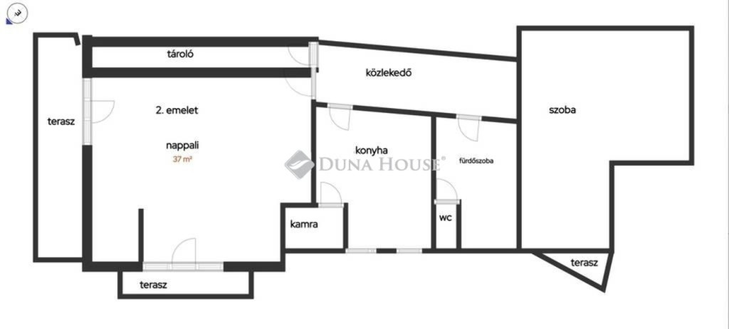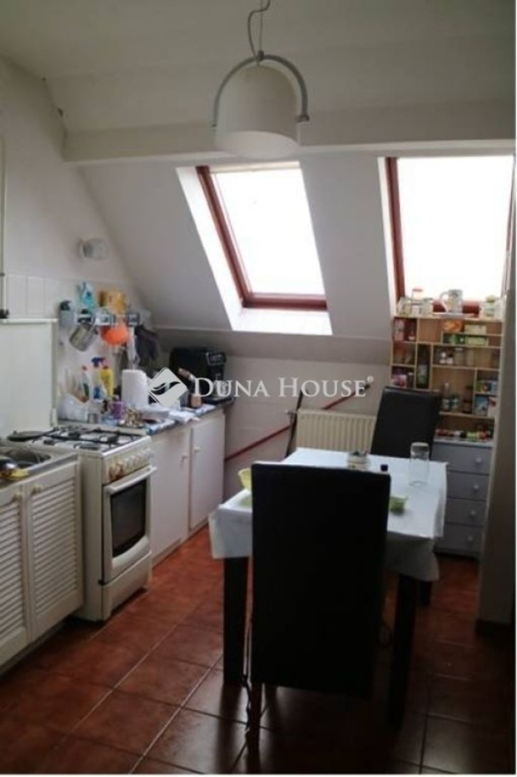 Belső lépcsőház visz a következő szintre, a tetőtérbe. Itt található a 2. lakás: 98 m²-es, összkomfortos, kétszobás: itt található a panorámás, erkélyes hálószoba, valamint a panorámás, két erkélyes nappali, egy tágas kamra, konyha, fürdőszoba és WC. A ház használatbavételi engedélye szerint a lakóterület 304 m², ehhez hozzáadva a 88 m² alagsort/pincét kapjuk meg a beépített összterületet.1998 óta felújítás nem történt. Az 1. lakás belmagassága 2,95 m. a 2. lakásé (tetőtér) 2,74 m.
