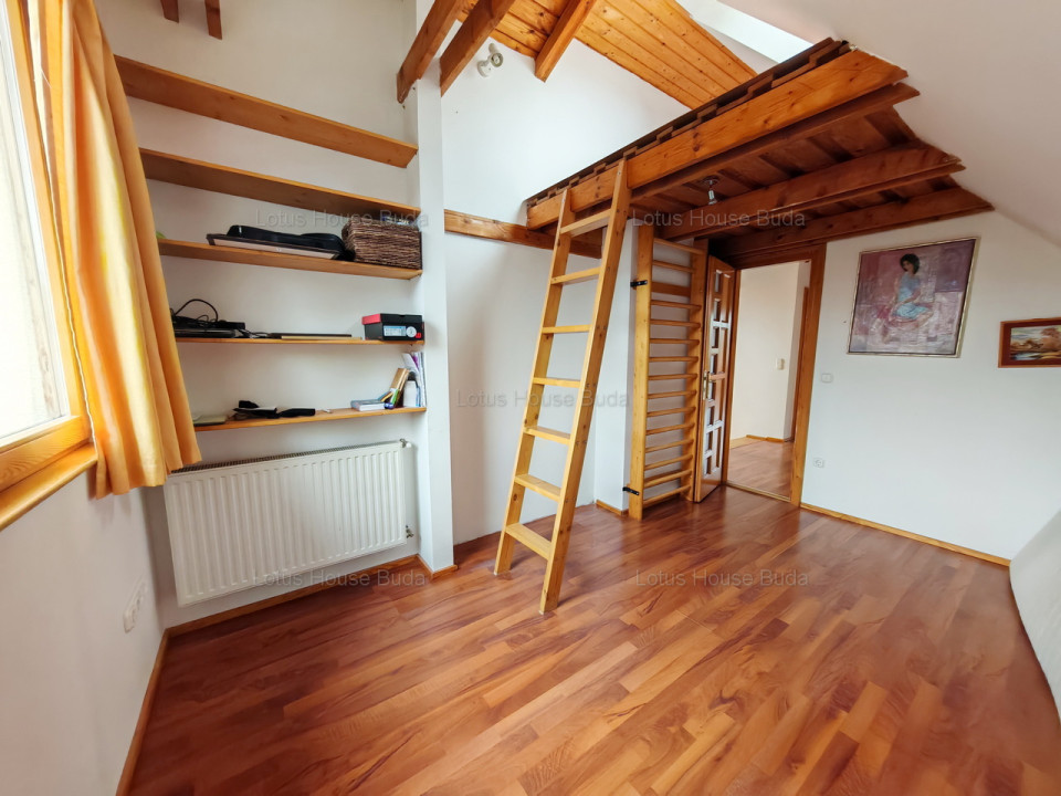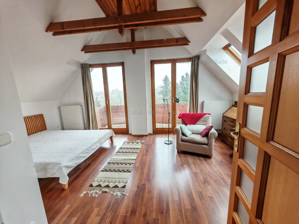 A lépcsőn felsétálva az emeletre hangulatos belső fogad minket a szabadon hagyott faszerkezetekkel, melyek két szobában ötletesen lettek galériának is kihasználva. Ezen a szinten a négy szoba mellett találunk több beépített szekrényt, egy gardróbot, fürdőt és egy külön WC-t is. A legnagyobb szobához egy hangulatos és igen kiváló kilátást biztosító erkély is kapcsolódik.