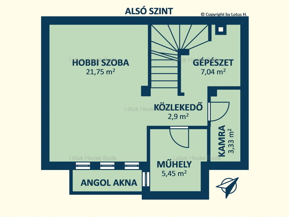 A ház pinceszintjén, mely angolaknán keresztül részben megvilágítást és szellőzést is kap, a kazánház kapott helyet egy műhely és a hobbiszoba társaságában. Ez a rész a lehetőségek tárháza!