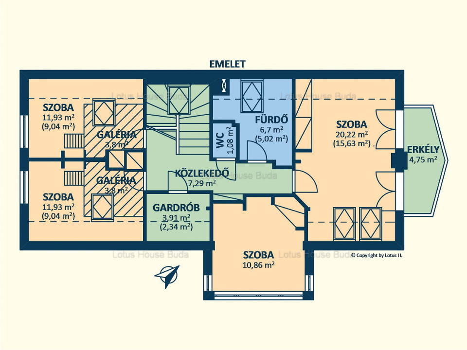 A földszinti rész hasznos alapterülete majd 79nm, míg a tetőtéri rész lakótere bruttó 74nm, a pince területe majd 41nm. A burkolt teraszok és erkély 100nm-re növeli a teret. A lenti amerikai konyhás étkezős tér 67nm, az emeleti szobák 20,2nm, 11,93nm-11,93nm nagyságúak.