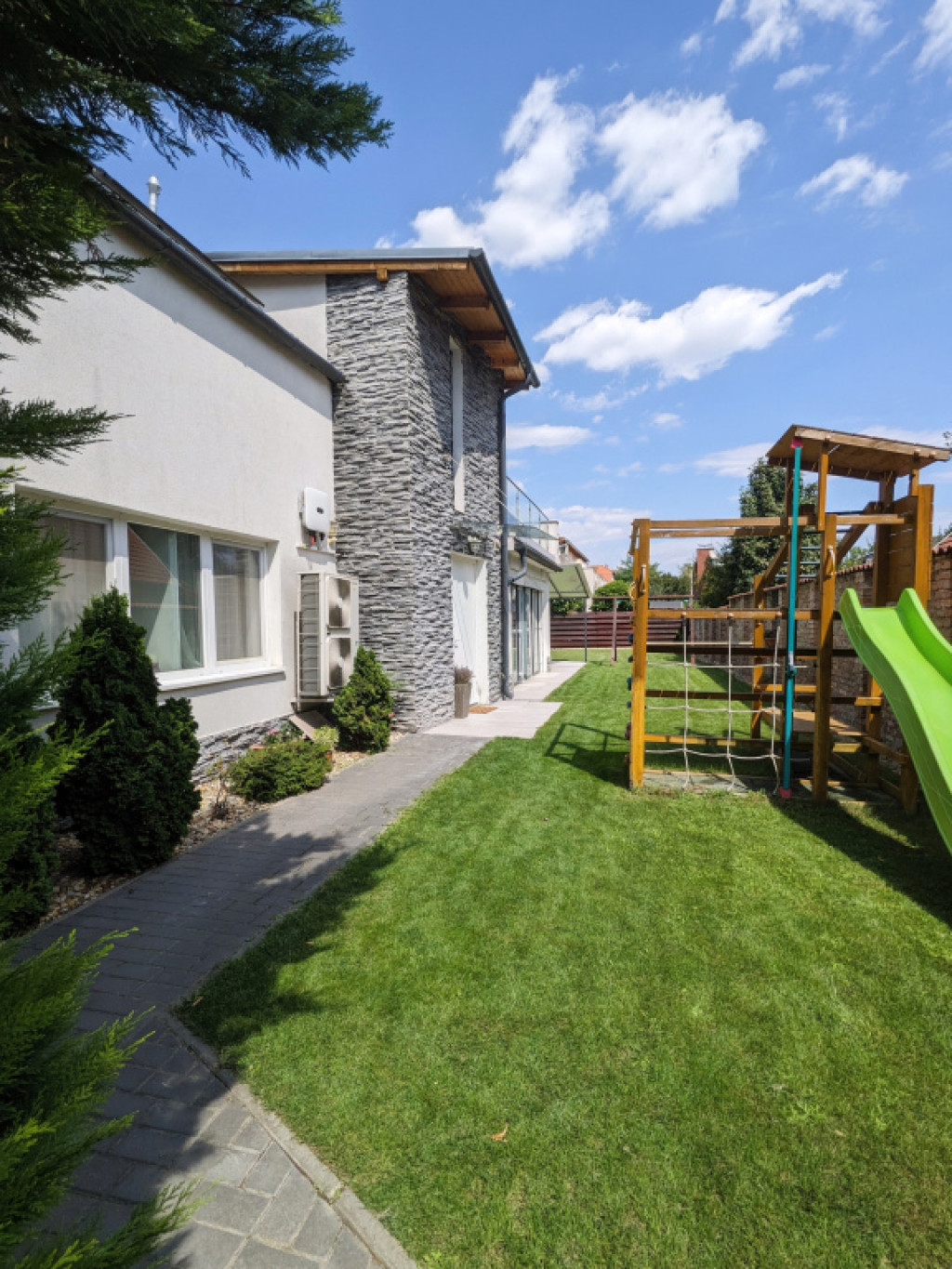 A telek 380 nm, a gondozott kertje teljesen szeparált, automata öntözőrendszerrel, elektromos kapuval, tárolóval, kényelmes autóbeállóval.