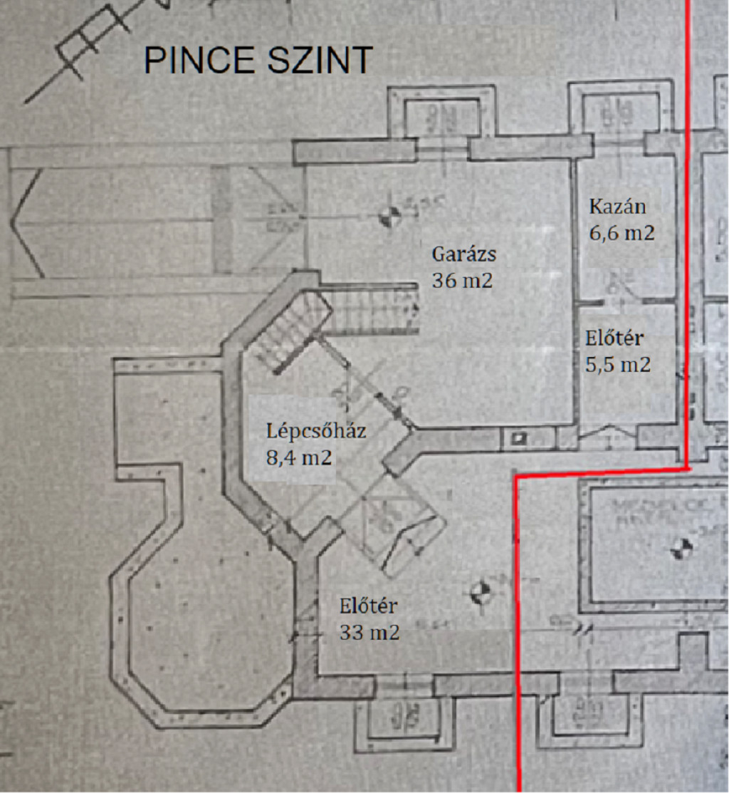fürdőszoba és egy kis nappali kapott helyet. A pince szinten található a 33m 2 garázs,