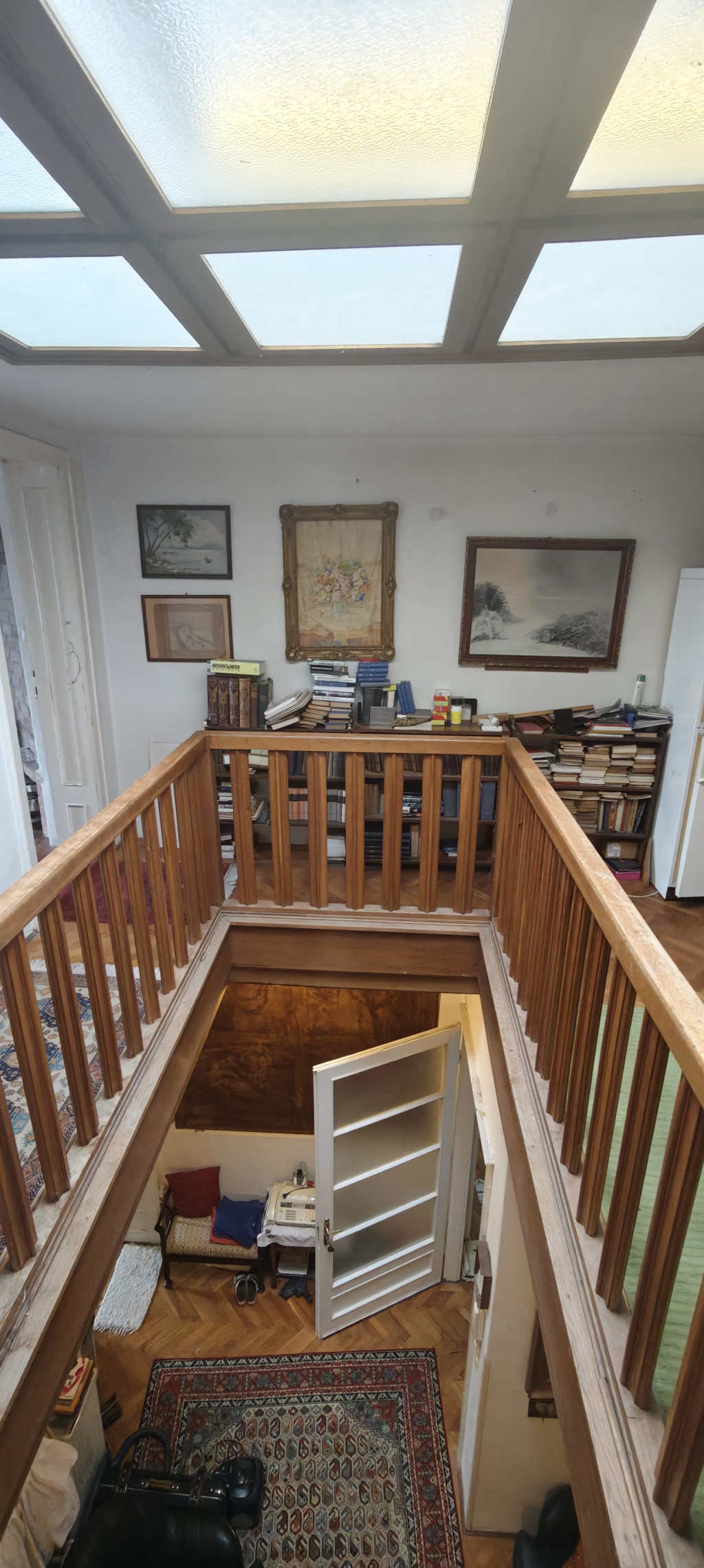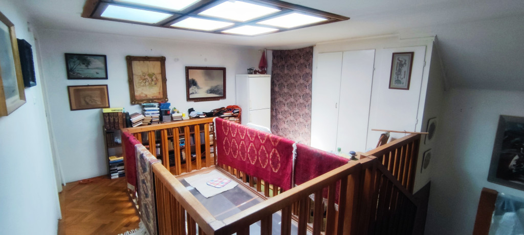 Az emelet és a tetőtér, egy lakásként funkcionál. Az emeletre a hallból, belső tölgyfalépcsőn jutunk fel. Itt a hall mennyezeti része nyitott, így a tetőtéri közlekedővel egy légtérben van. Úgy lett kialakítva, hogy a tetőablakok a hallba is fényt biztosítsanak. A tetőtérben még egy nagyobb szoba is kialakítható. Összesen 5 db fürdőszoba és 4 db konyha van jelenleg kiépítve.