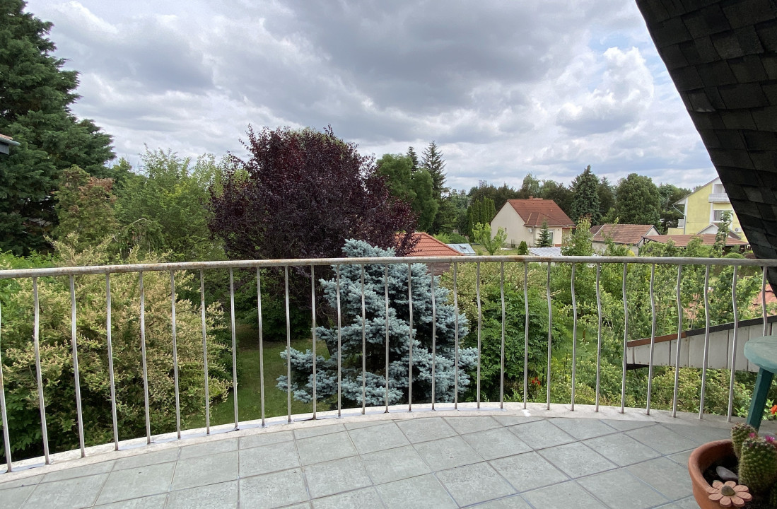 Az emeleti erkélyről elénk tárul a környező kertek békés hangulata – egy csésze kávéval a kézben, egy szinttel a világ fölött.