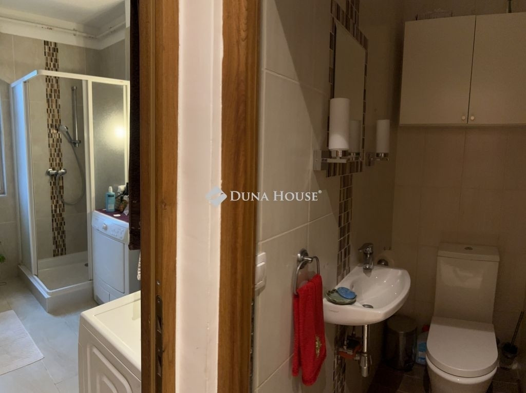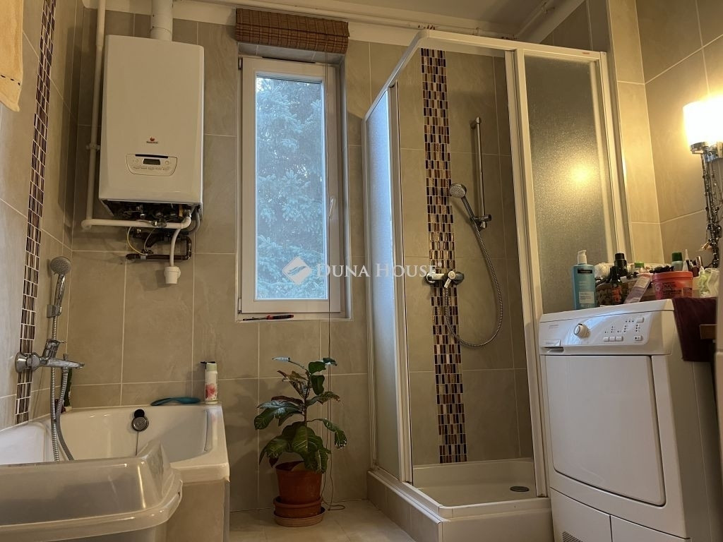 A káddal és zuhanykabinnal felszerelt, nagy ablakon szellőző fürdő kifejezetten tágas, elfér benne mosó- és szárítógép egyaránt; a wc önálló helyiségben kapott helyet.