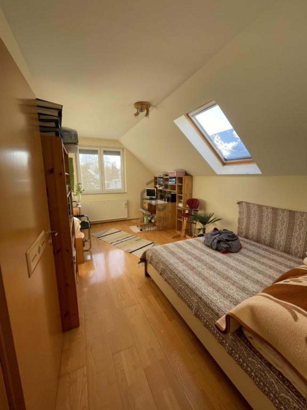 -egy jelenleg hálószobaként használt, nagy méretű szoba, beépített szekrényekkel,