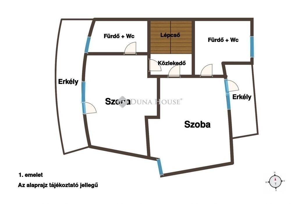 1. emelet: két hálószoba, mindegyik saját fürdőszobával és erkéllyel.