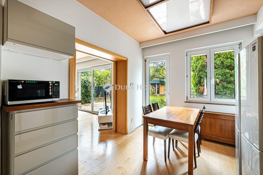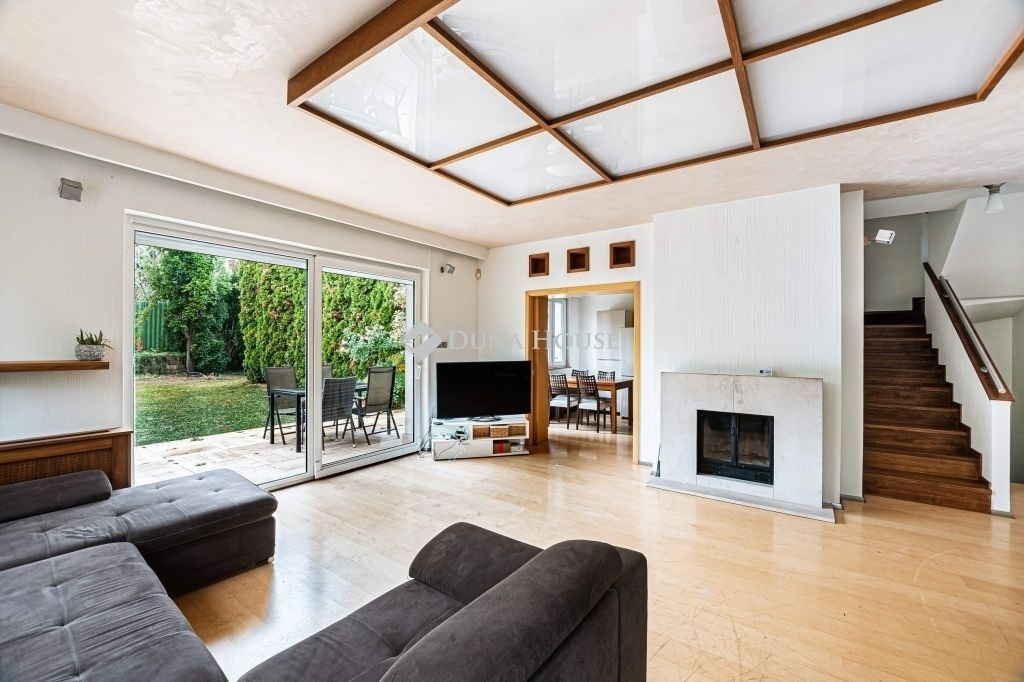 A kandalló hangulatos életteret ad. A nagy teraszajtón keresztül látható az intim hangulatú kert és innen lehet kijutni a hátsó teraszra is.