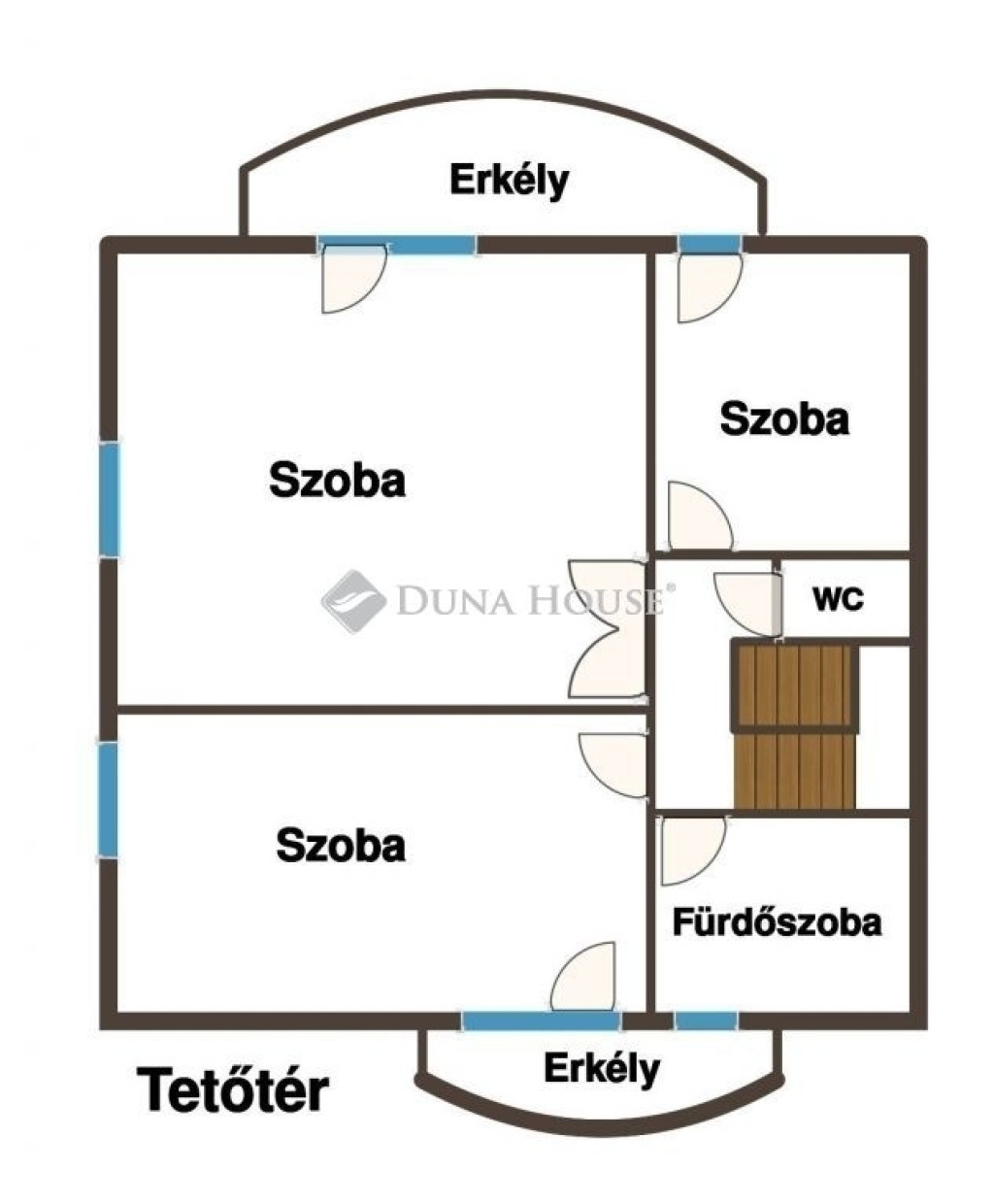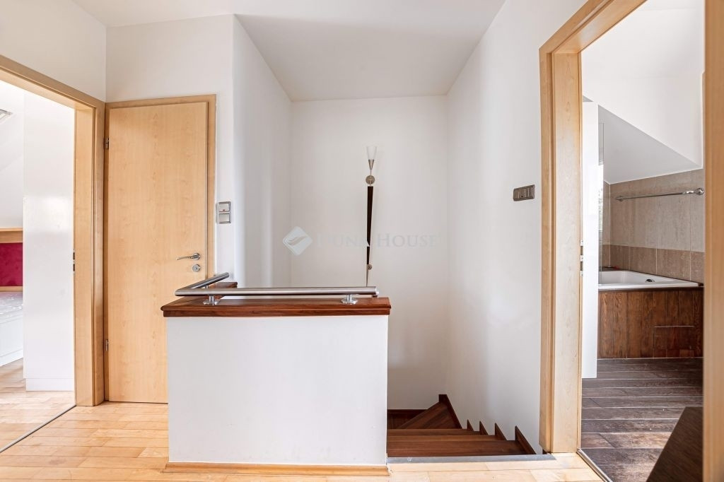 - Az emeleten 3 nagy méretű hálószoba található, egyedileg gyártott, asztalos által beépített bútorokkal, melyek természetesen a vételár részét képezik. Itt található még egy kádas fürdőszoba, külön WC és mindkét oldalon egy-egy panorámás erkély. Mindhárom szobának van erkélykapcsolata.