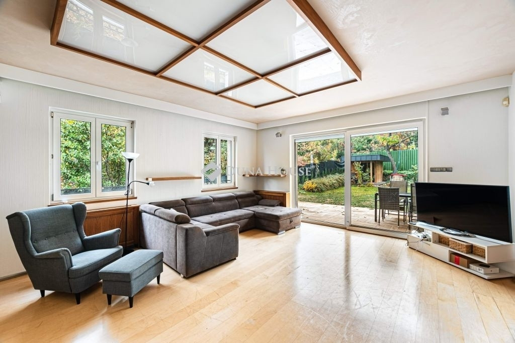 III.kerület kedvelt hegyvidéki részén, a Táborhegyen eladó egy 3 szintes, panorámás ikerházfél, melyhez 500m2-es gondozott telek tartozik