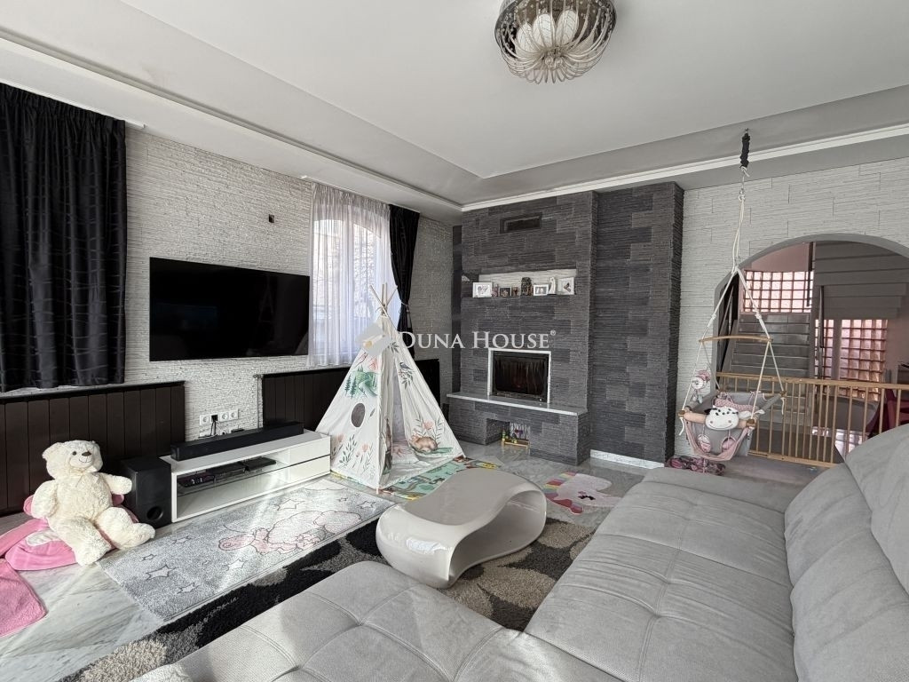 A ház központi tere a tágas nappali, ahol kandalló gondoskodik az otthonos hangulatról.