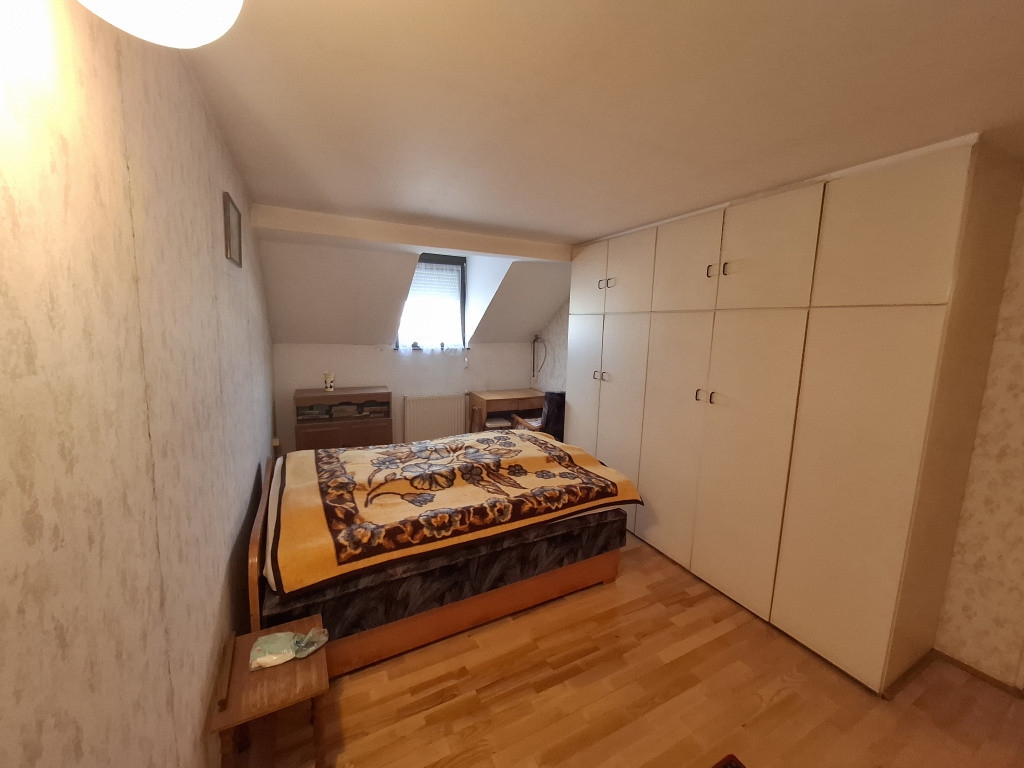 Közös előszoba után szinte azonos az elrendezés, de annyi különbséggel, hogy a tetőtér is be lett építve és csak az egyik lakrész felől használható, így ott nappali és 2 külön nyíló szoba van tetőtérben, míg a másik lakás esetében nappali és kisszoba, ezek egymásból nyílnak.