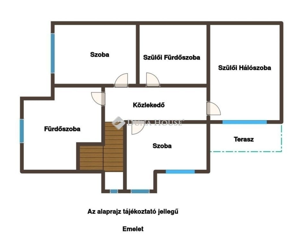 külön nyíló 3 szoba (egyik erkéllyel), 2 fürdő-wc, közlekedő, lépcsőtér.
