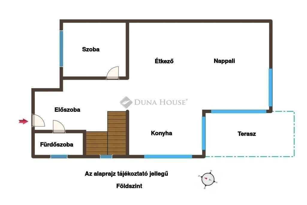 kertkapcsolatos nappali, hálószoba, konyha, étkező, fürdő-wc, előtér, lépcsőtér.