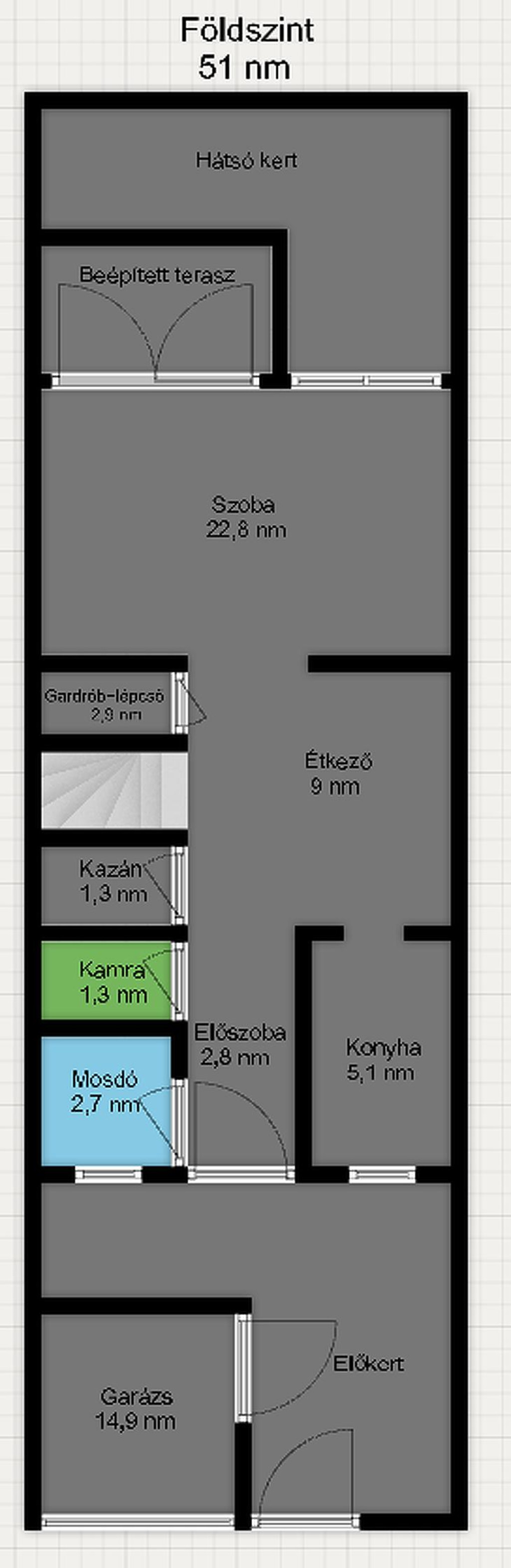 A földszinten kialakításra került egy nagy nappali, mely könnyedén két szobára osztható, konyha, étkező, kamra, gardrób, wc, egy kb 10 nm-es, beépített terasz és egy kb. 20 nm-es kert.
