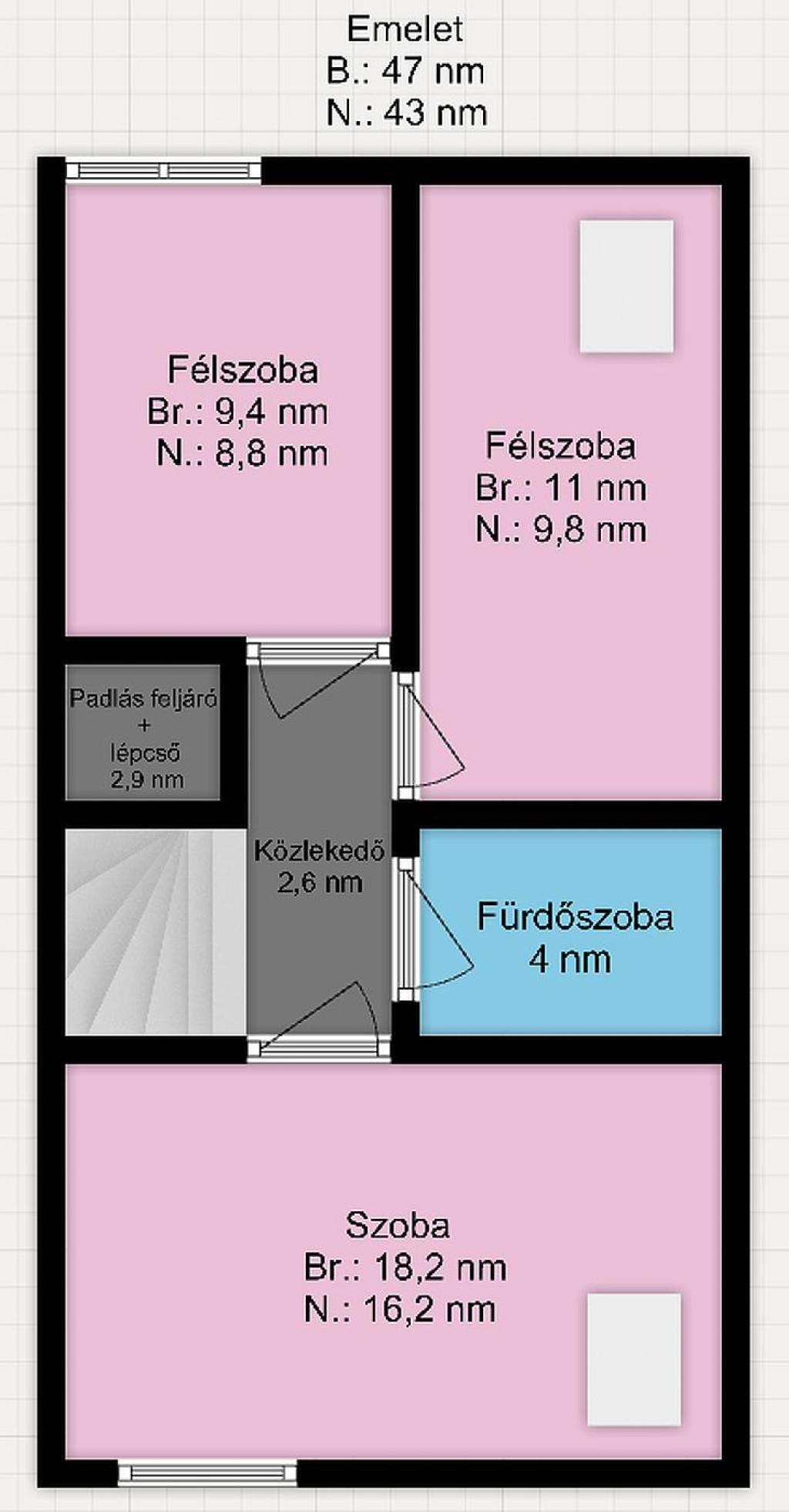 Az emeleten 1+2 félszobát, kádas fürdőszobát és gardróbot találunk. A tetőtérben pedig lehetőség nyílik egy újabb, bruttó 15 nm-es, nettó 10 nm-es szoba kialakítására.