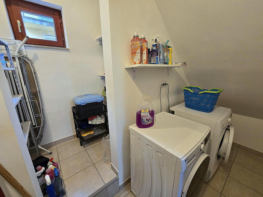 A házhoz 20 m2 PINCE tartozik, itt található a gépészet, a gázkazán és vegyestüzelésű kazán, valamint egy 200 literes meleg víz tároló. Ezek a tetőtéri lakást is ellátják. Tűzifa tároló is itt található.