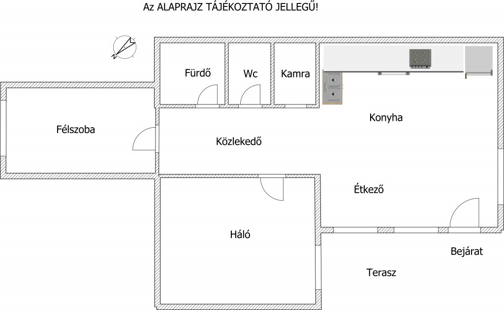 Az ingatlan helyiségei: étkező-konyha, 1+1 félszoba. A központban egy tágas, benapozott étkező-konyha található, amely közvetlen kertkapcsolattal rendelkezik, továbbá egy teljes értékű nappali, és egy hálószoba, valamint egy fürdőszoba, külön mellékhelyiség és egy praktikus kamra.
