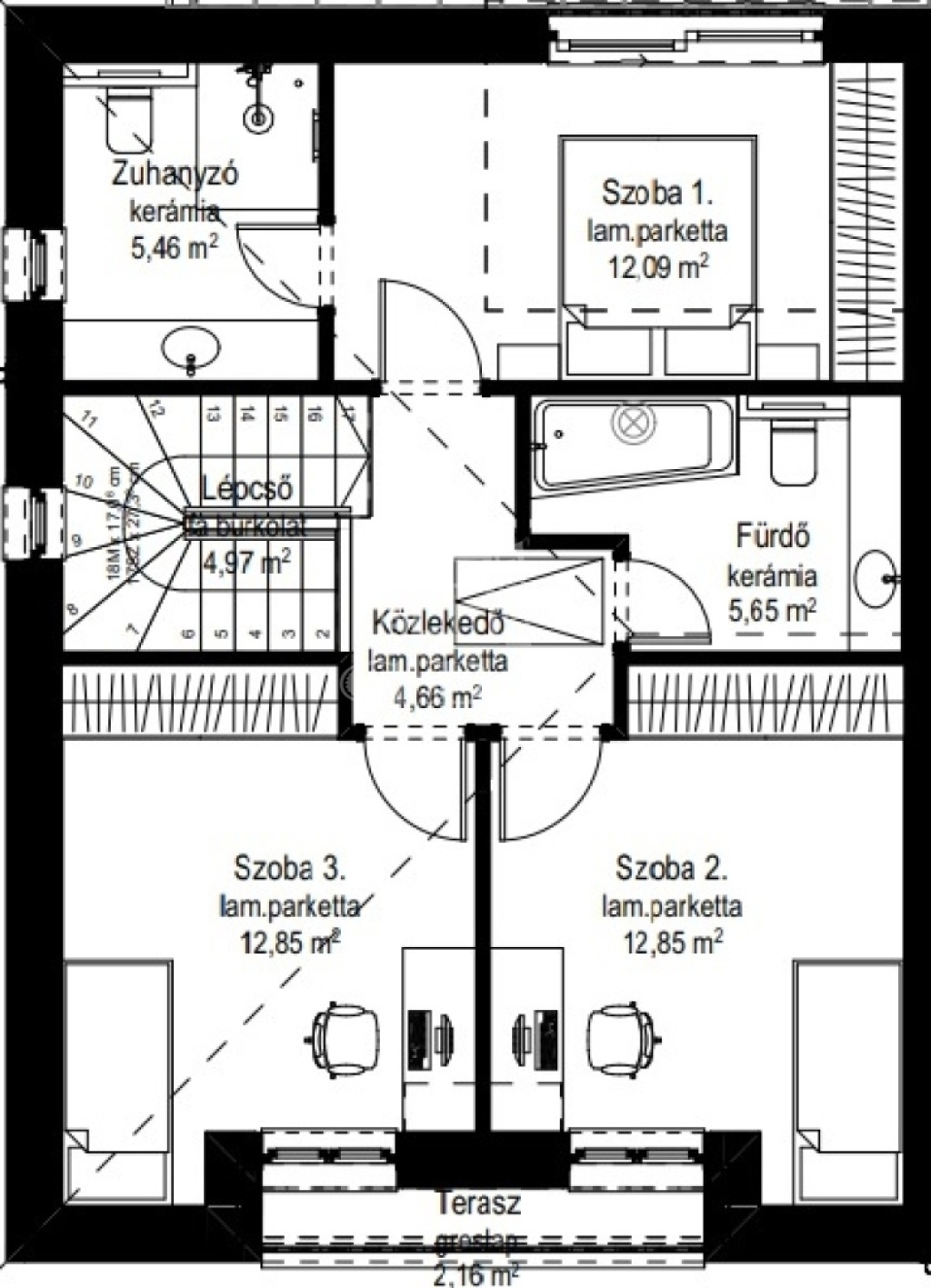 Fürdőszobák: összesen 3 (2 az emeleten, 1 a földszinten)
