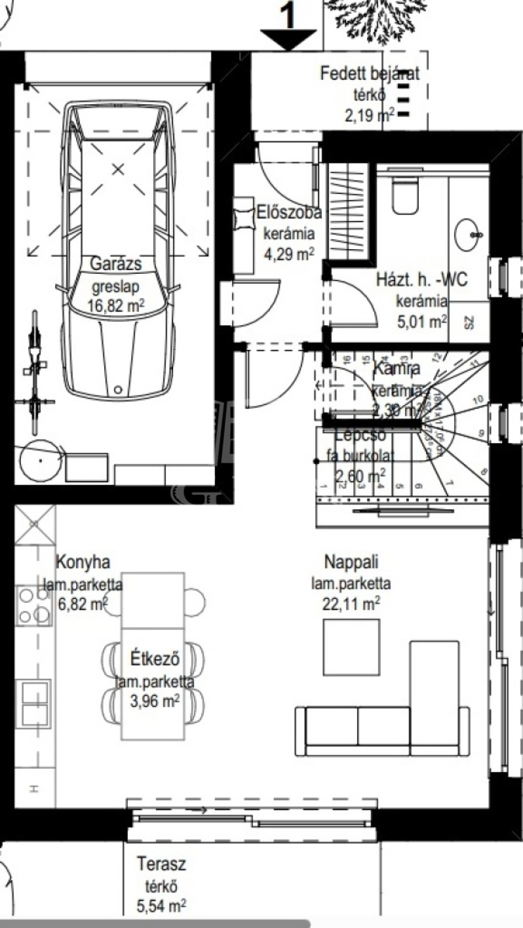 Nappali: 33 m²-es amerikai konyhás tér, közvetlen teraszkapcsolattal