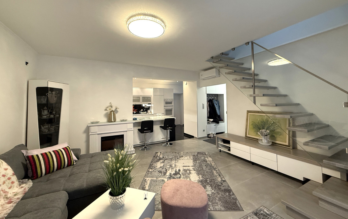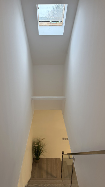- nappali térből elegáns természetes fénnyel megvilágított lépcsővel a tetőtéri szobákhoz