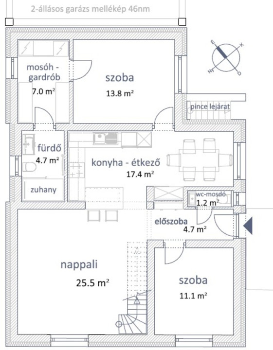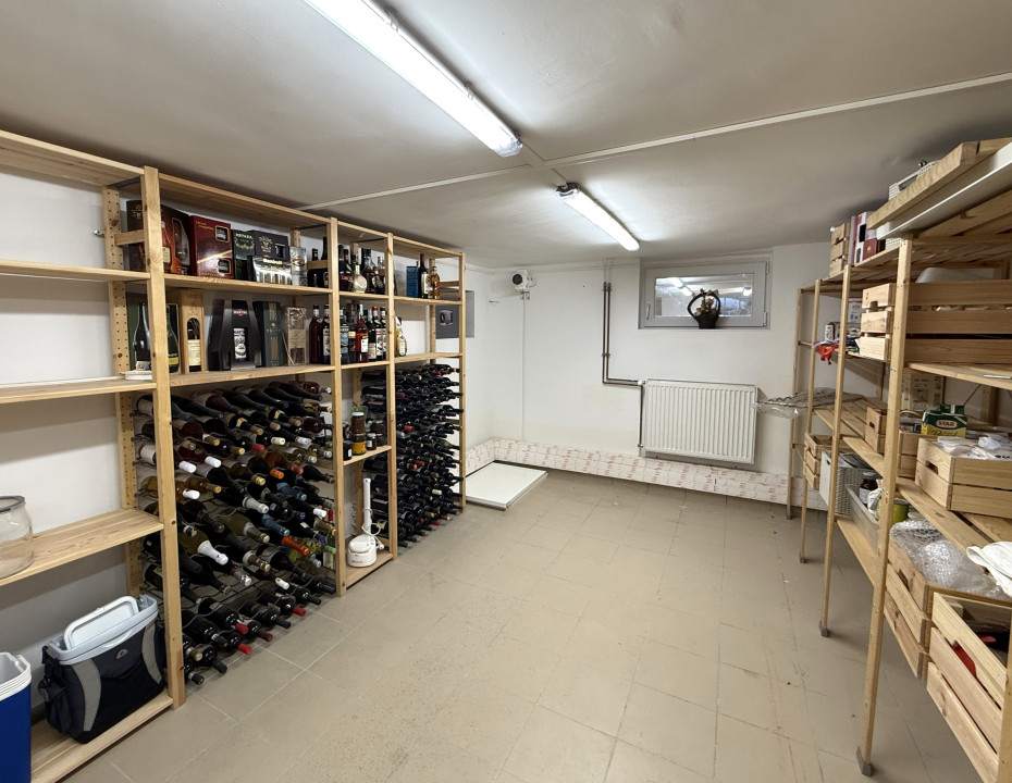 - külső fedett pincelejárattal megközelíthető ablakos 2 nagyméretű tároló helyiség (kb. 18nm és 24nm alapterületekkel), tároló és gépészeti területekkel (kazánokkal, inverterrel stb)