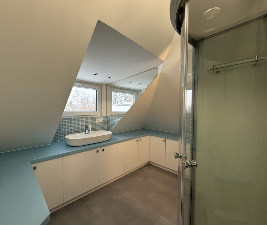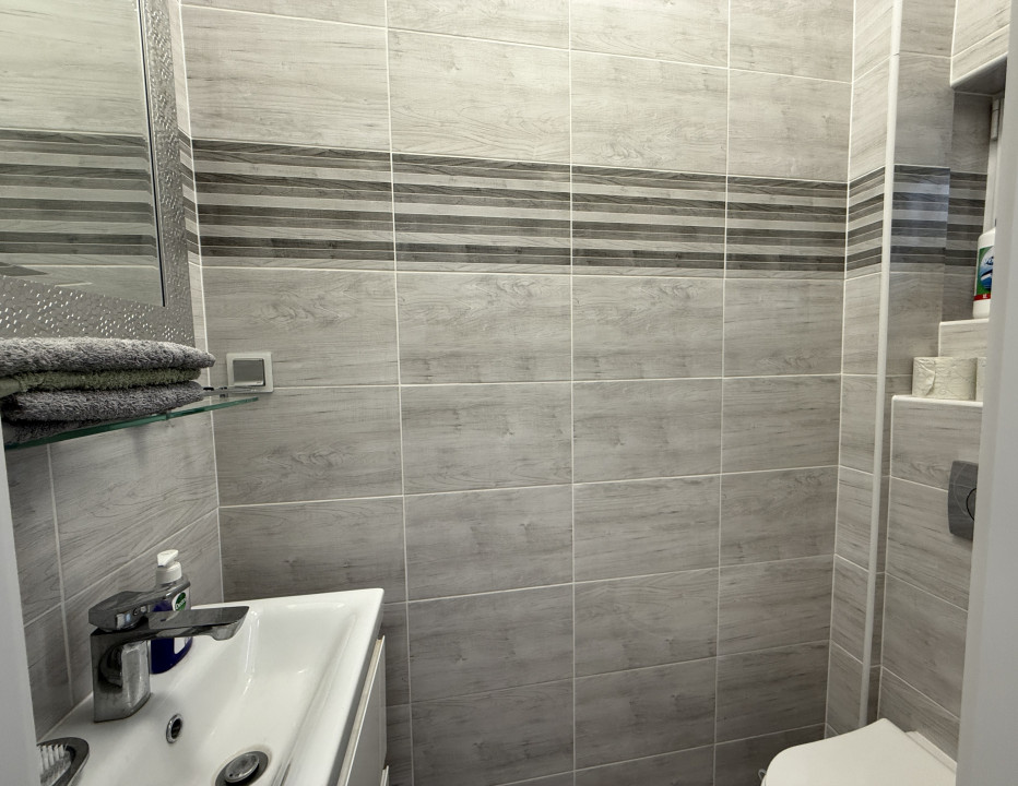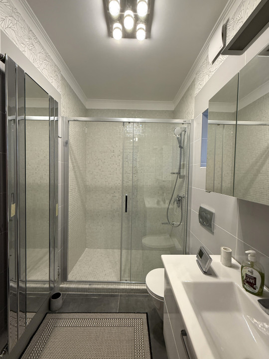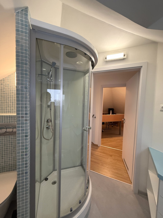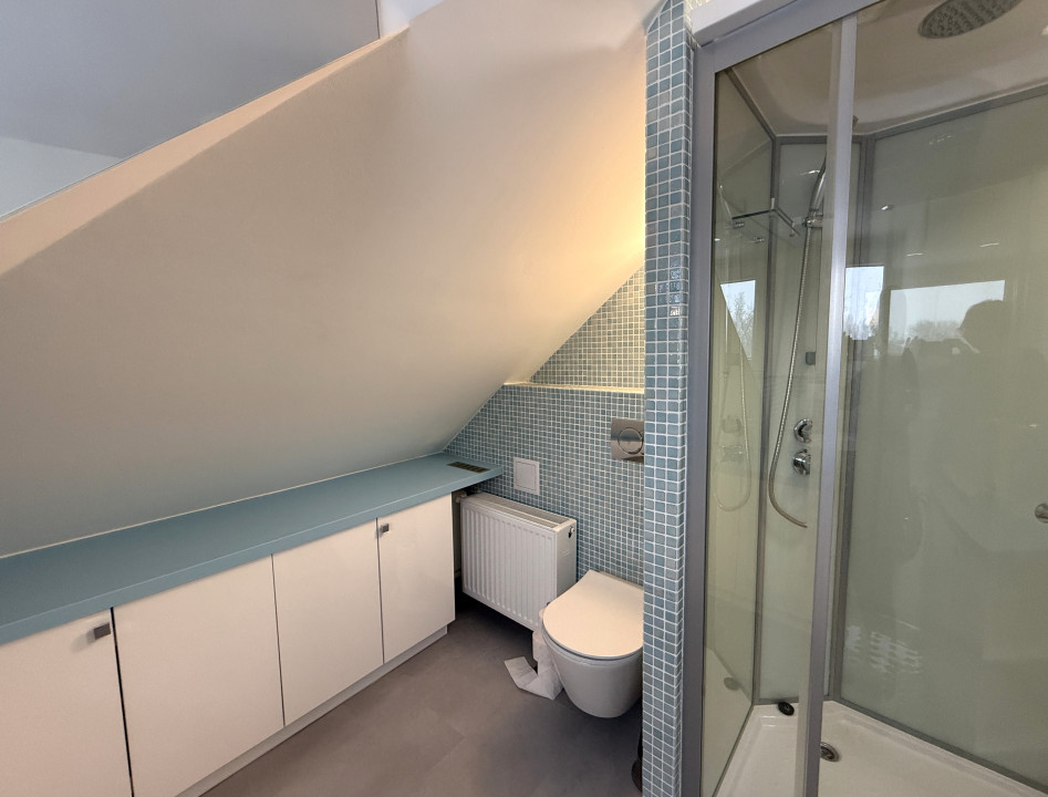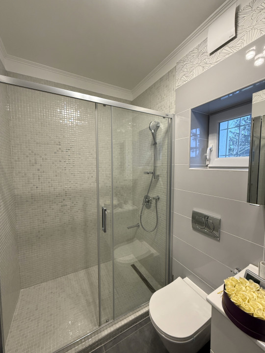 - elegáns természetes fénnyel megvilágított fürdőszoba zuhanyzóval és wc-vel, mosdó szekrényekkel,