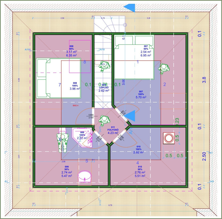 - központi közlekedőből nyíló 1 szoba (8,2 nm 1.90m feletti alapterülettel) plusz 2 félszoba (kb. 6-6 nm 1,90m feletti alapterülettel) tetőtéri ablakokkal, utóbbiak akár dolgozó szobaként,