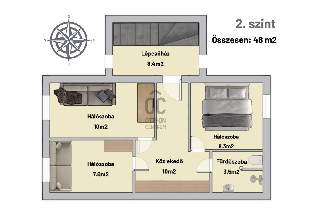 - Közlekedő, három hálószoba, fürdőszoba-wc.