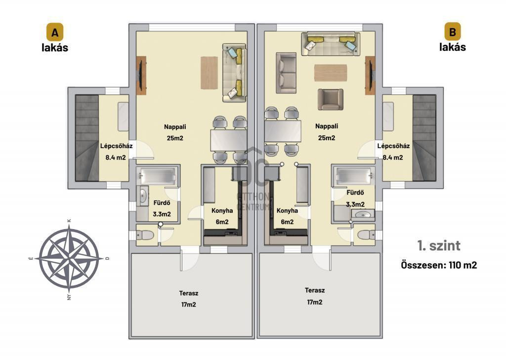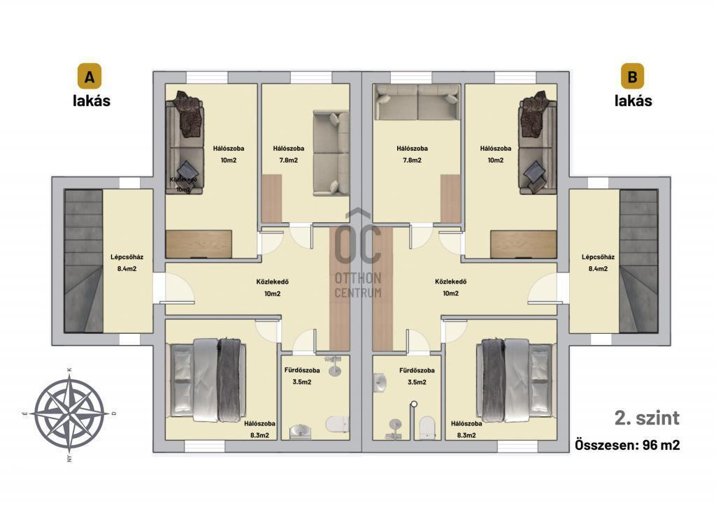 - Mindkét lakáshoz tartozik egy autóbeálló hely, igény esetén garázs kialakítható az alsó szinten.