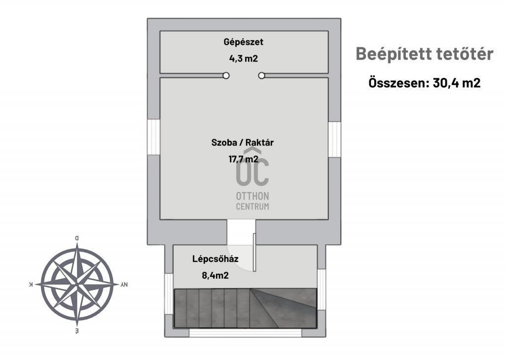 - Egy légterű, tetőablakkal bevilágított 22 m2-es helyiség.