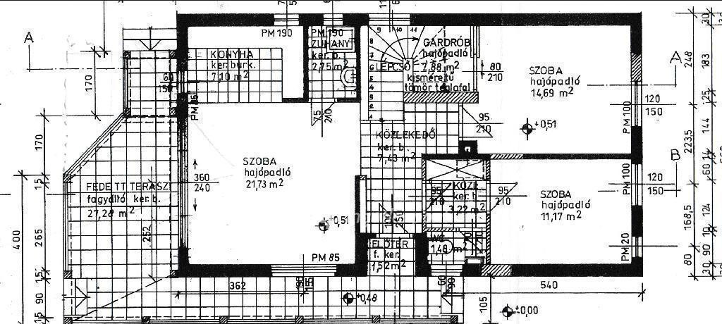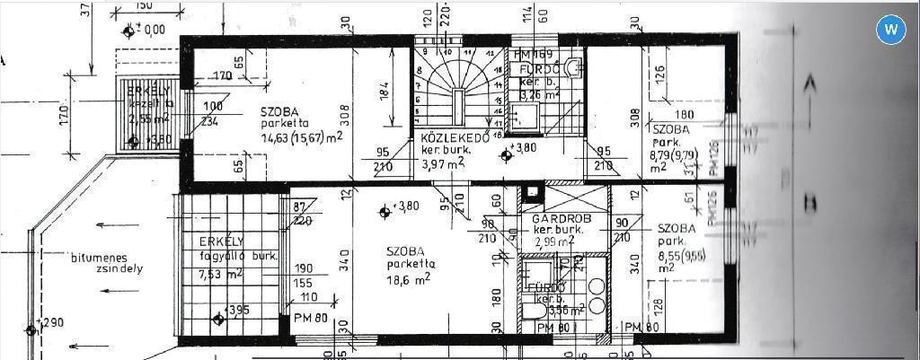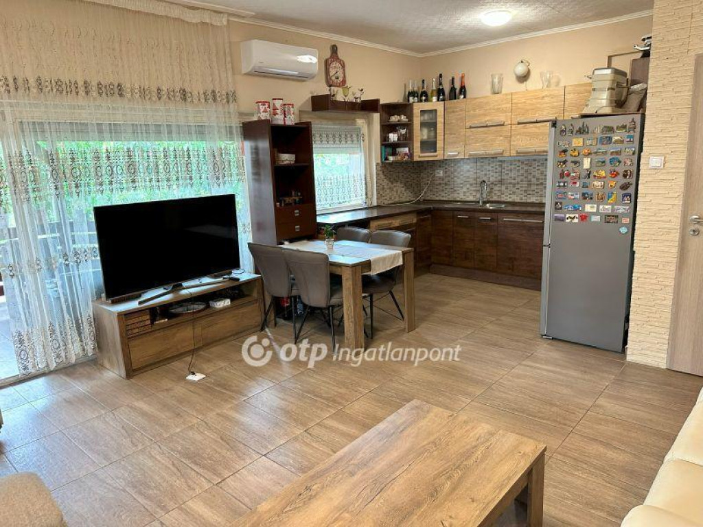 Az amerikai konyhás nappaliban, valamint a vizes helyiségekben járólap a szobákban valódi faburkolat van.