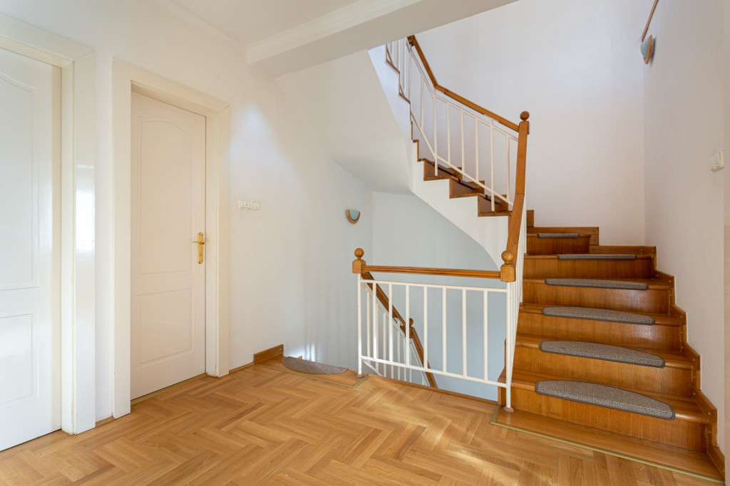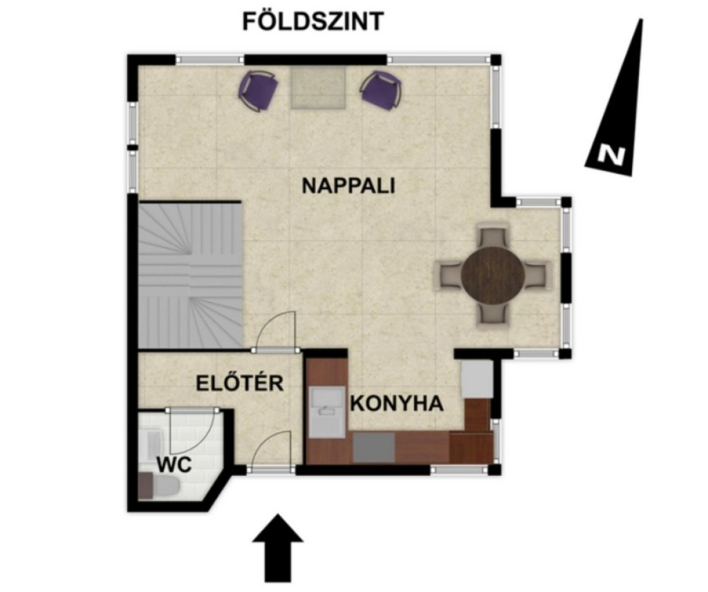 Emelt földszintjén előszoba, vendégmosdó és a kerthez kapcsolódó méretes terek biztosítják a napközbeni élet teljességét.