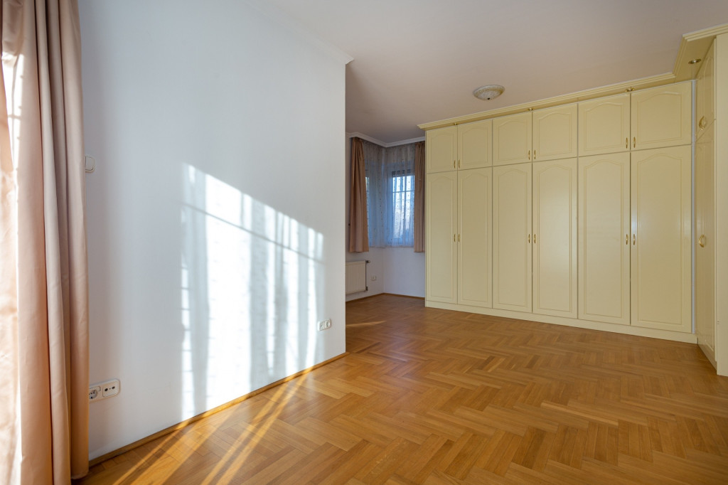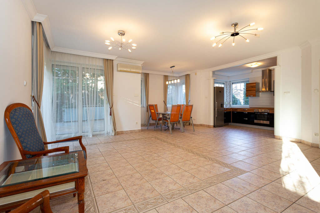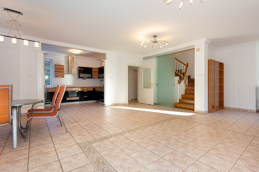 Kiváló helyen, csendes zsákutcában elegáns ikerházfél vált elérhetővé 2 garázzsal, 5 hálóval, 3 fürdővel, tágas – terasz és kertkapcsolatos étkezős konyhás nappalival, lehetőségteli, szaunás alagsorral, térkövezett, parkosított kerttel.
