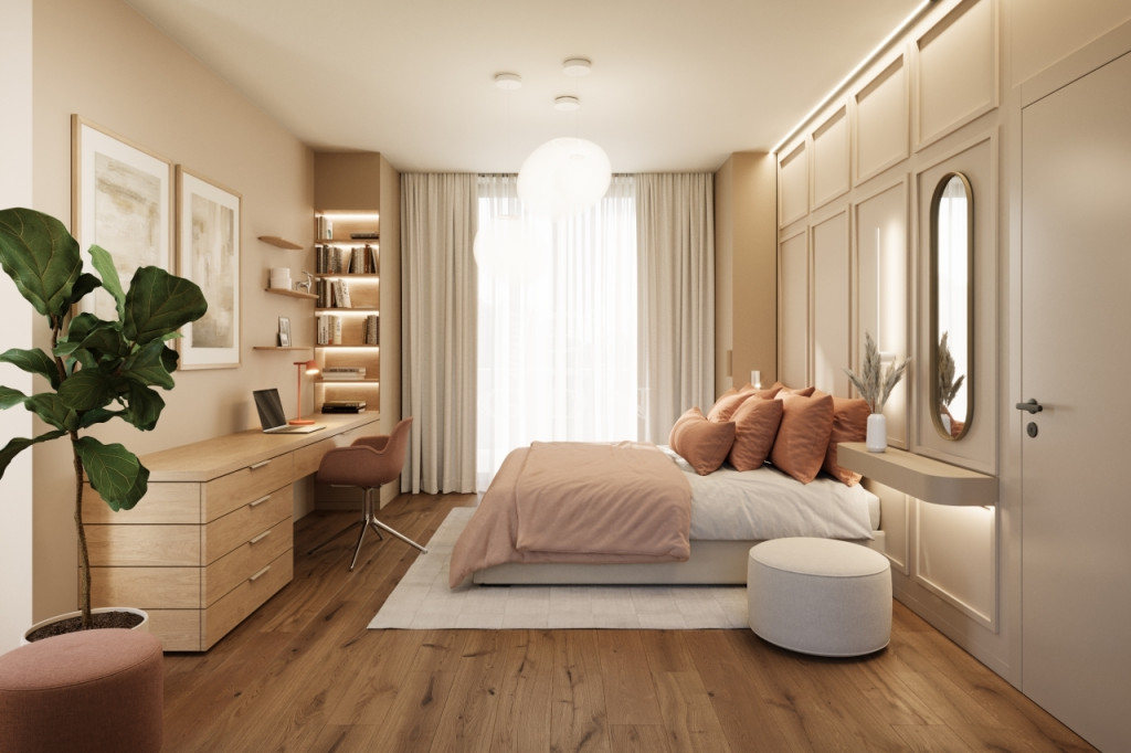Az enteriőrt beépített méretre készült egyedi bútorok, világítótestek, tapéták, textiliák, teszik egyedivé és különlegessé.