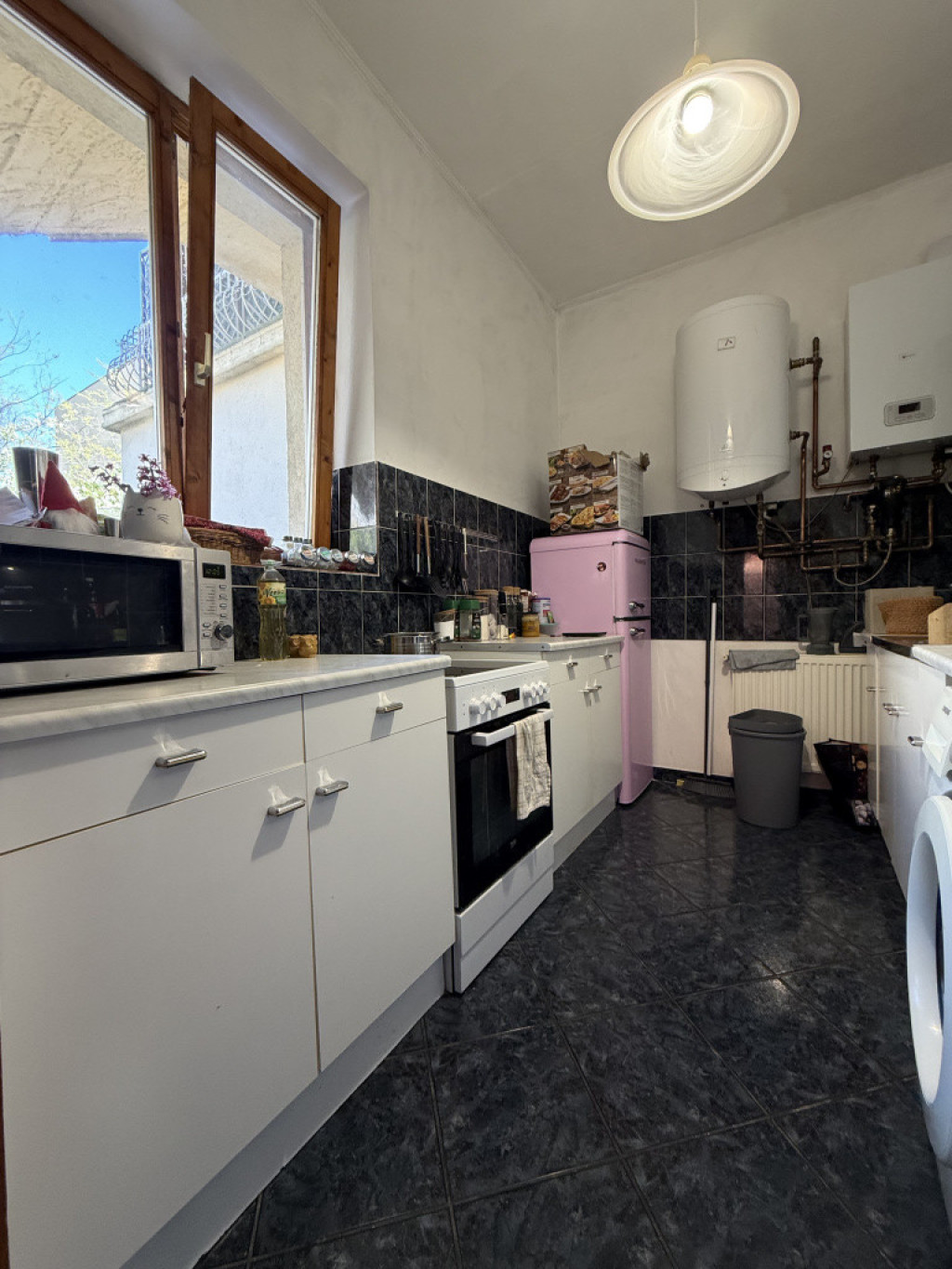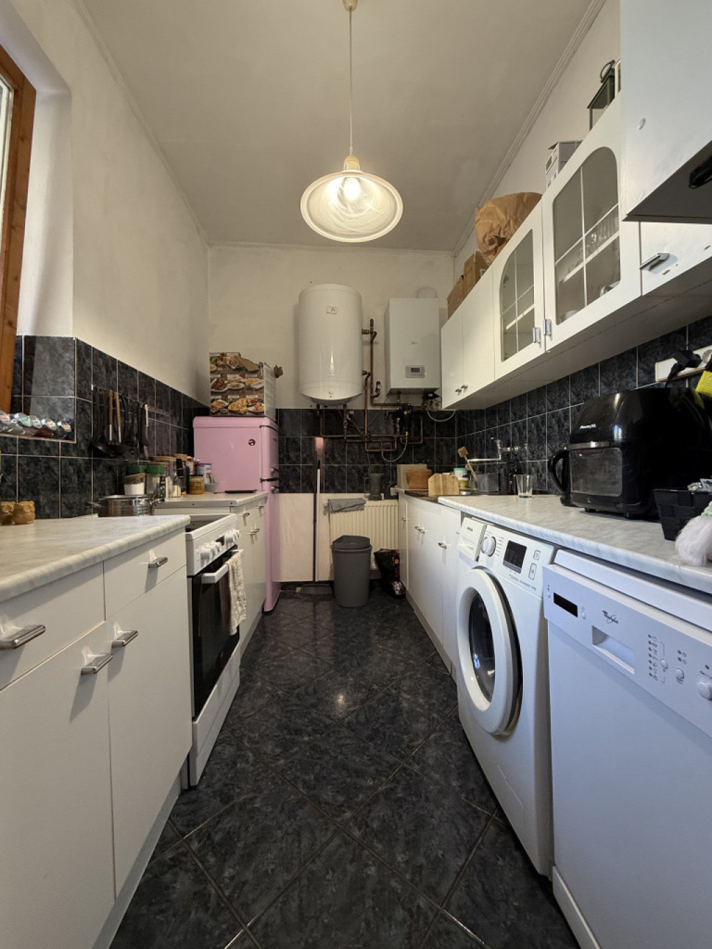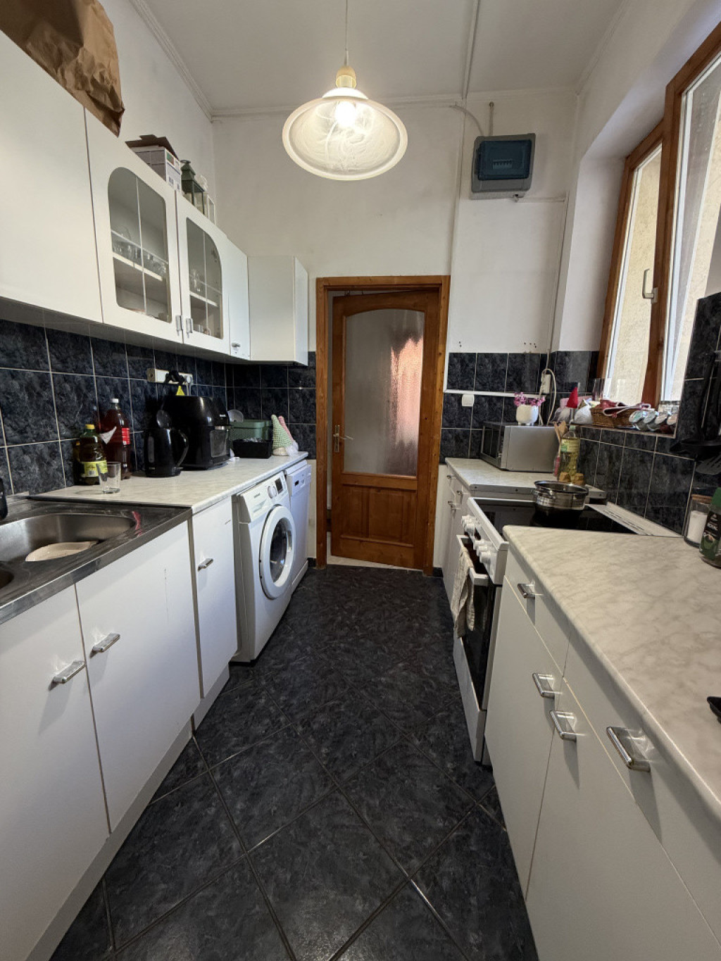 A ház az 1922-ben épült, többször felújították. A lakásba lépcsőn jutunk fel, az előszobával szemben helyezkedik el a nagy ablakos konyha konyhabútorral, villanytűzhellyel, mosogatógéppel felszerelt, a mosógép is itt kapott helyet. A nappali és az innen nyíló szoba nyugati fekvésű, világos, nem látni be az utcáról. A kisebbik szoba a bejárat mellett helyezkedik el. A fürdőszoba mosdóval, káddal felszerelt, a toalettel egy helységben kapott helyet.