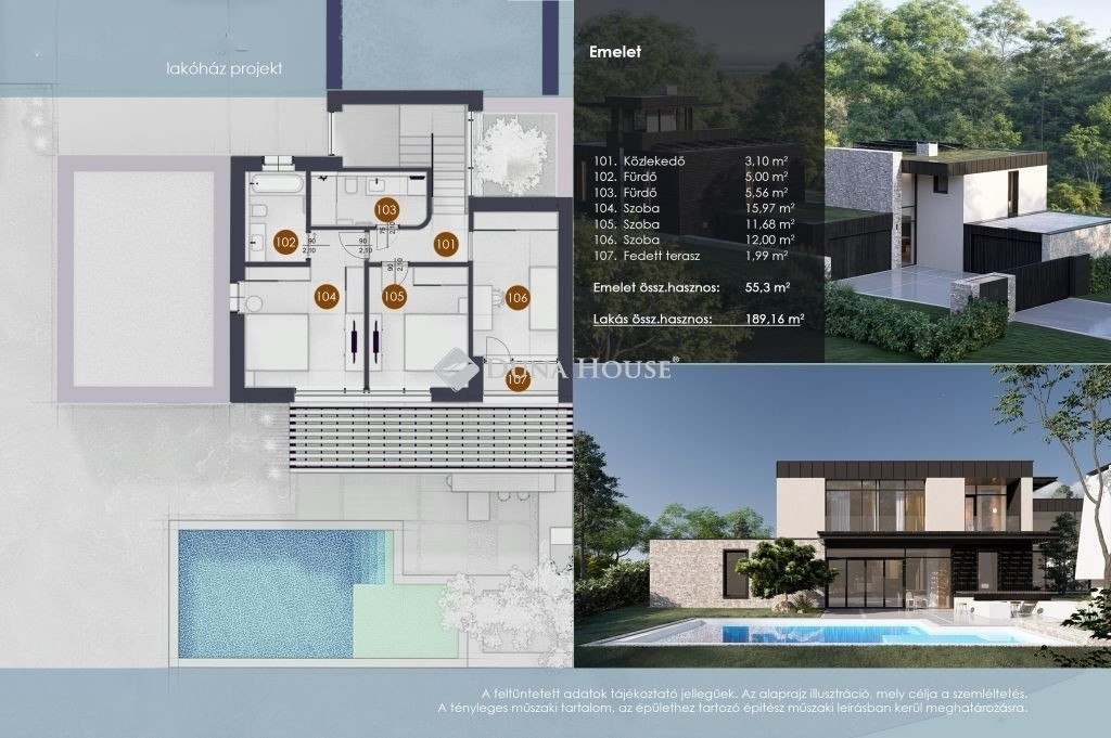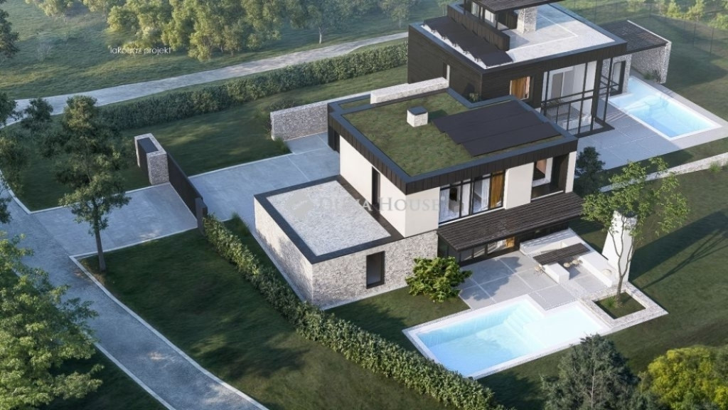 Eladó egy új építésű, belső kétszintes, 189 m²-es luxusvilla-projekt kültéri medencével, 1700 m²-es déli fekvésű panorámás telken, érintetlen erdő ölelésében.