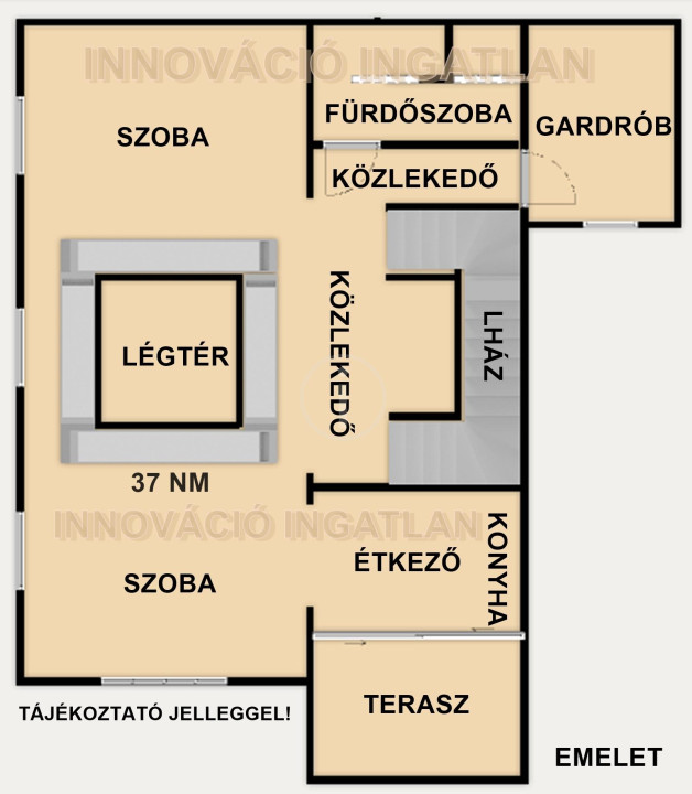 az ELSŐ SZINT 81 nm + 8 nm TERASZ, - a nyitott terek lezárásával azonnal önálló lakássá alakítható, - jelenleg egylégterű, mellékhelyiséges zuhanyzós fürdőszoba, beépített, gépesített étkezős konyha,