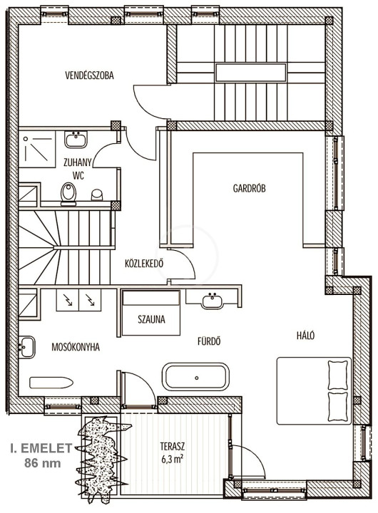 a MÁSODIK SZINT 69 nm + 5 nm TERASZ, összkomfortos 2 szobás penthouse jellegű lakás elosztású,