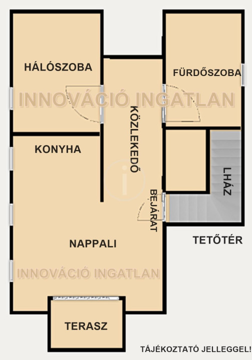 az ELSŐ SZINT 81 nm + 8 nm TERASZ, - a nyitott terek lezárásával azonnal önálló lakássá alakítható, - jelenleg egylégterű, mellékhelyiséges zuhanyzós fürdőszoba, beépített, gépesített étkezős konyha,