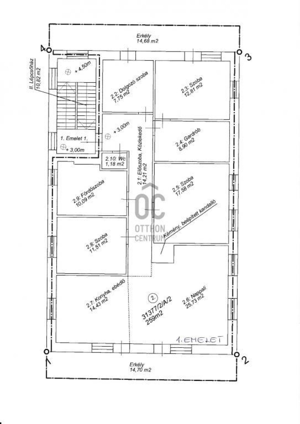 -az első emeleten kialakított lakrész nettó alapterülete 145.1 m2, amely a konyha és nappali mellett 5 szobát, 1 fürdőszobát és egy tágas gardróbot foglal magában. A lakáshoz két erkély tartozik.